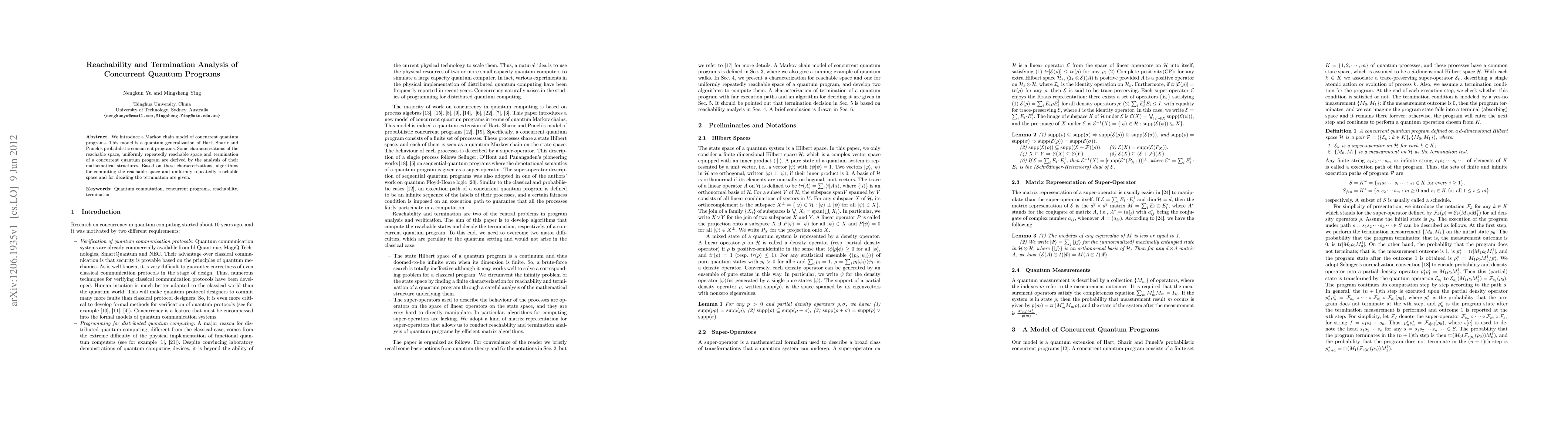 This paper develops a Markov chain model for concurrent quantum programs, generalizing classical probabilistic models, and provides algorithms for analyzing reachability, uniformly repeated reachability, and termination based on the mathematical structures of these programs.