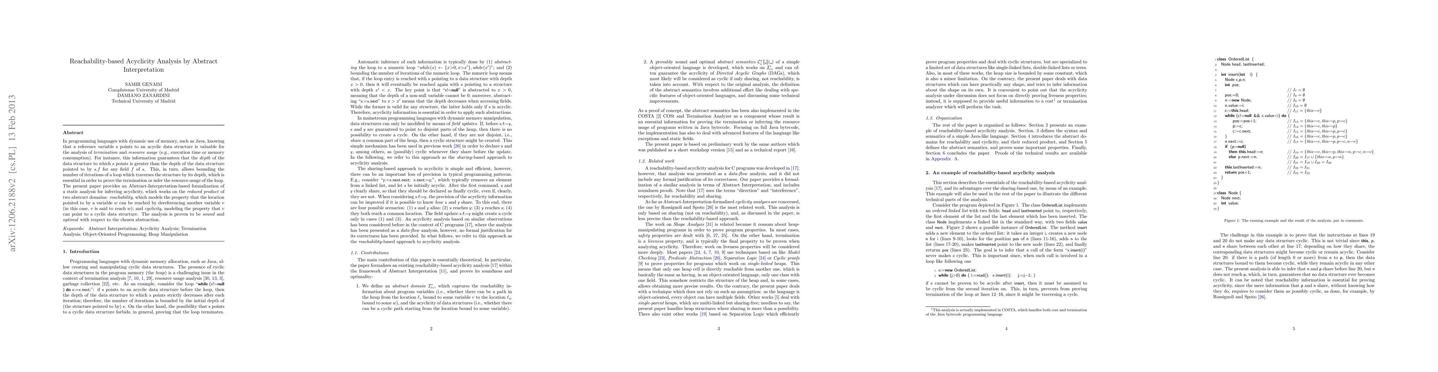The paper presents an abstract interpretation-based formalization of an acyclicity analysis, defining abstract domains for reachability and cyclicity, and proving the soundness and optimality of the proposed approach.