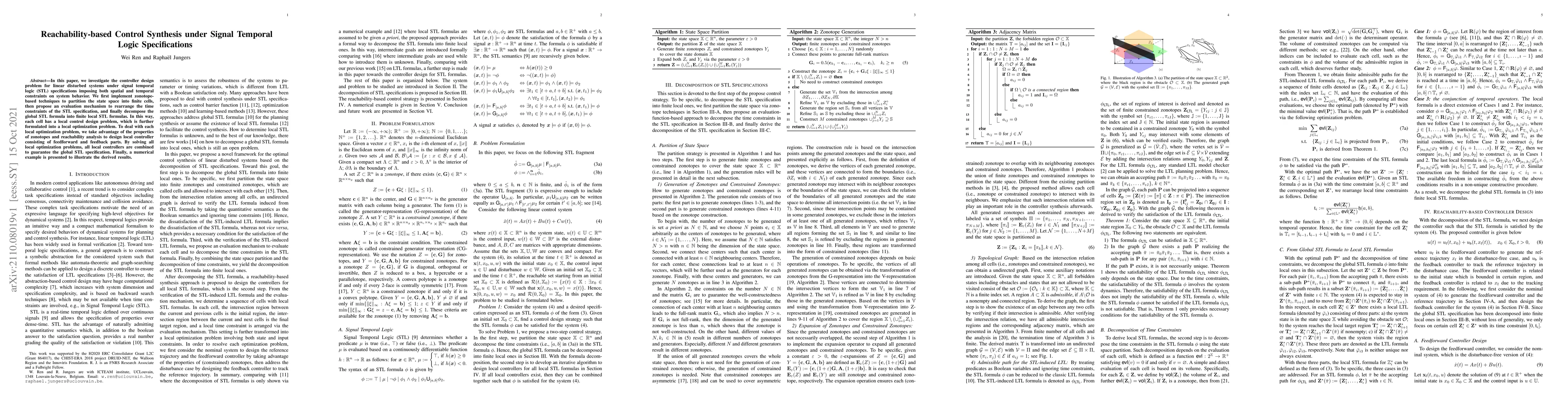 This paper designs controllers for linear systems under signal temporal logic (STL) specifications, using zonotope-based state space partitioning and reachability analysis. It decomposes global STL constraints into local optimization problems, solving each to synthesize local controllers that collectively meet the global STL specification.