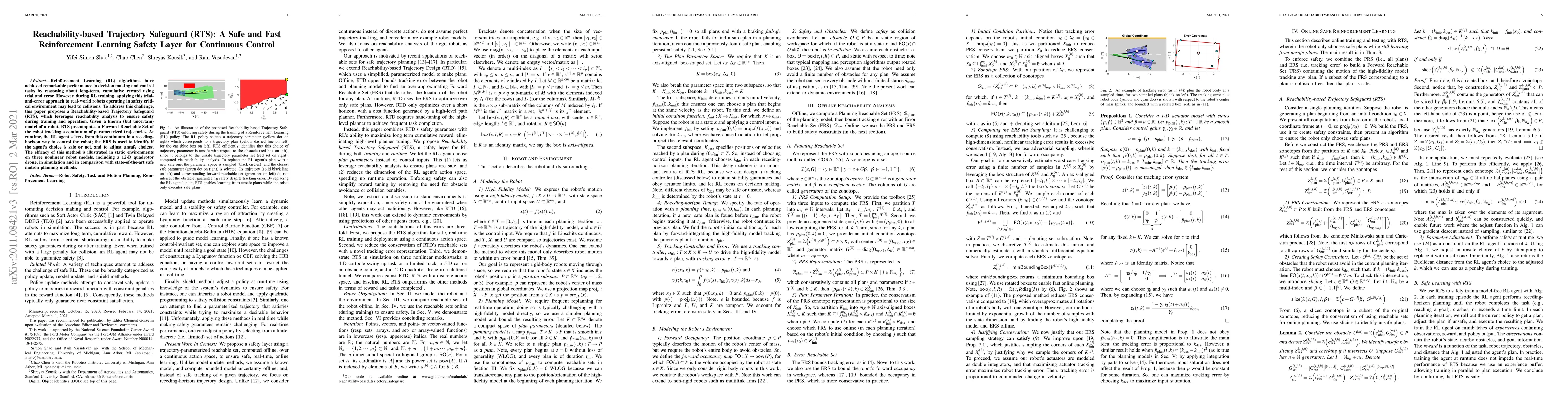 This paper introduces the Reachability-based Trajectory Safeguard (RTS) to ensure safety in reinforcement learning for continuous control tasks. RTS uses reachability analysis to precompute safe trajectories, enabling the RL agent to select safe actions in real-time, thereby preventing collisions in safety-critical environments.