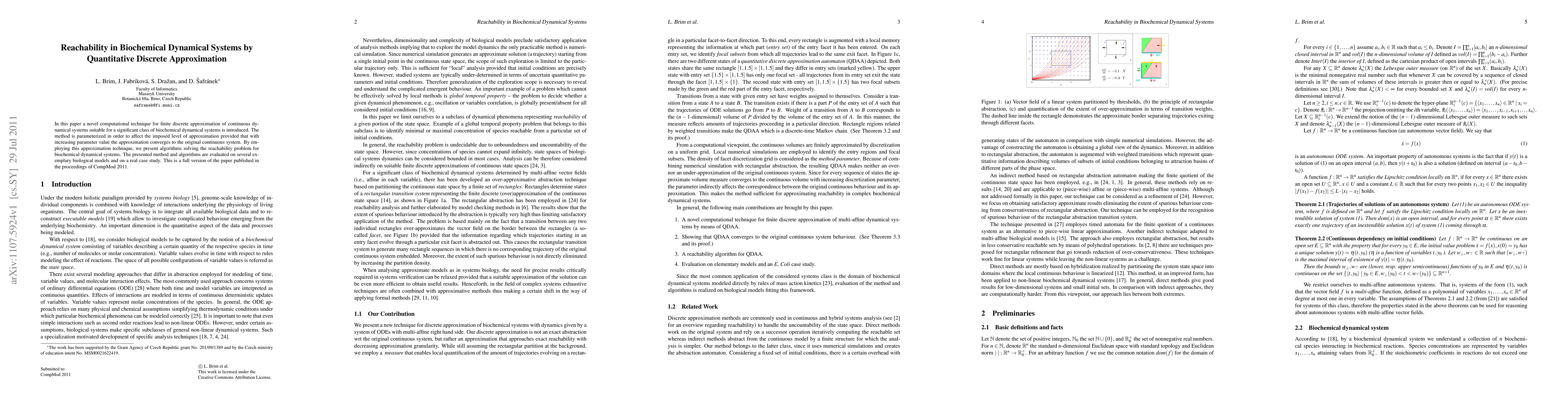 This paper introduces a novel computational technique for approximating continuous biochemical dynamical systems through finite discrete methods, enabling the solution of reachability problems. The algorithms developed using this approach are evaluated on various biological models and a real case study, demonstrating their effectiveness.