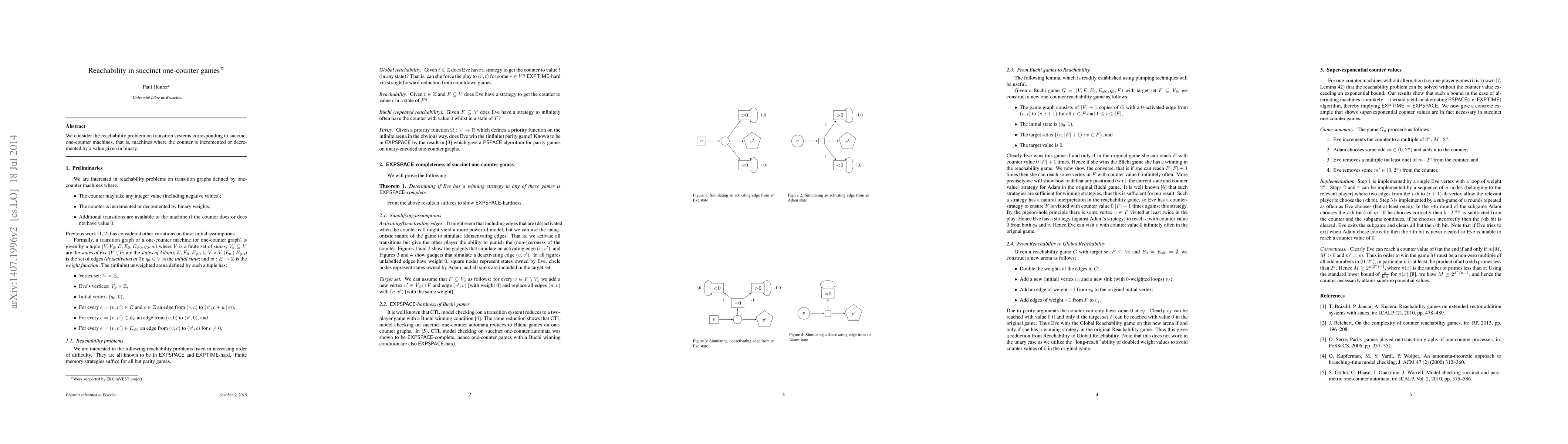 Summary: This paper investigates the reachability problem in succinct one-counter games, focusing on transition systems derived from one-counter machines with binary-encoded increment and decrement operations. The study aims to determine the computational complexity of determining if a state can be reached from a given initial state.