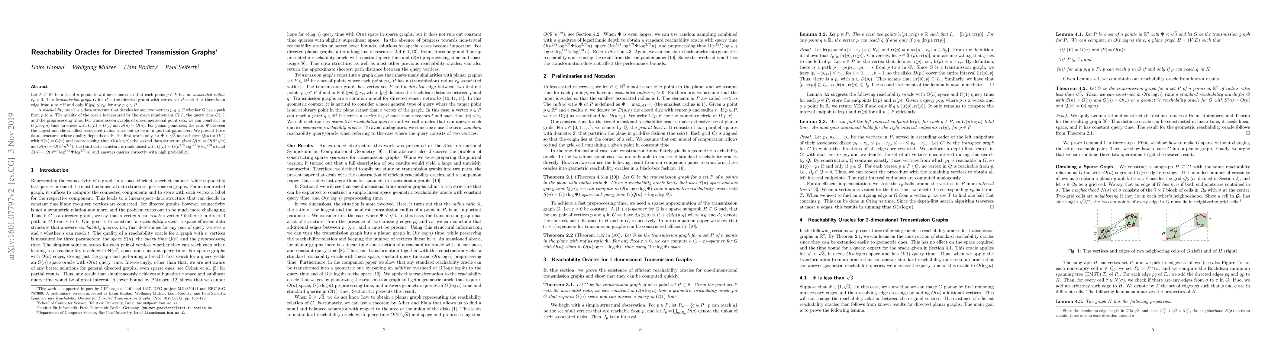 Let $P \subset \mathbb{R}^d$ be a set of $n$ points in $d$ dimensions such that each point $p \in P$ has an associated radius $r_p > 0$. The transmission graph $G$ for $P$ is the directed graph with vertex set $P$ such that there is an edge from $p$ to $q$ if and only if $|pq| \leq r_p$, for any $p, q \in P$. A reachability oracle is a data structure that decides for any two vertices $p, q \in G$ whether $G$ has a path from $p$ to $q$. The quality of the oracle is measured by the space requirement $S(n)$, the query time $Q(n)$, and the preprocessing time. For transmission graphs of one-dimensional point sets, we can construct in $O(n \log n)$ time an oracle with $Q(n) = O(1)$ and $S(n) = O(n)$. For planar point sets, the ratio $\Psi$ between the largest and the smallest associated radius turns out to be an important parameter. We present three data structures whose quality depends on $\Psi$: the first works only for $\Psi < \sqrt{3}$ and achieves $Q(n) = O(1)$ with $S(n) = O(n)$ and preprocessing time $O(n\log n)$; the second data structure gives $Q(n) = O(\Psi^3 \sqrt{n})$ and $S(n) = O(\Psi^3 n^{3/2})$; the third data structure is randomized with $Q(n) = O(n^{2/3}\log^{1/3} \Psi \log^{2/3} n)$ and $S(n) = O(n^{5/3}\log^{1/3} \Psi \log^{2/3} n)$ and answers queries correctly with high probability.