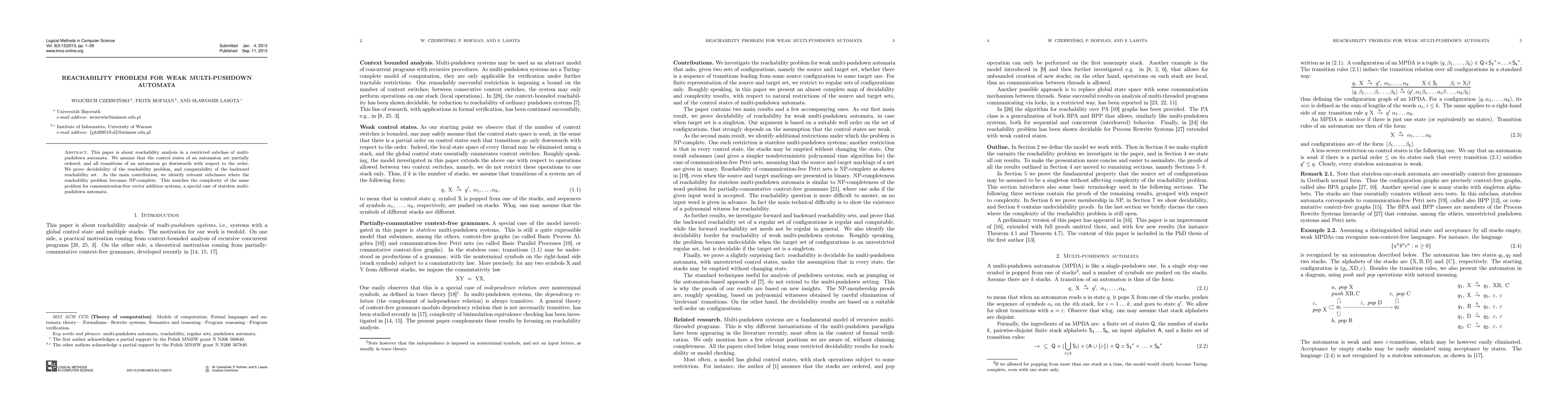 This paper investigates the reachability problem for a subclass of weak multi-pushdown automata with downward transitions. It proves decidability and computability of the backward reachability set, and identifies subclasses where the problem becomes NP-complete, aligning with the complexity of communication-free vector addition systems.