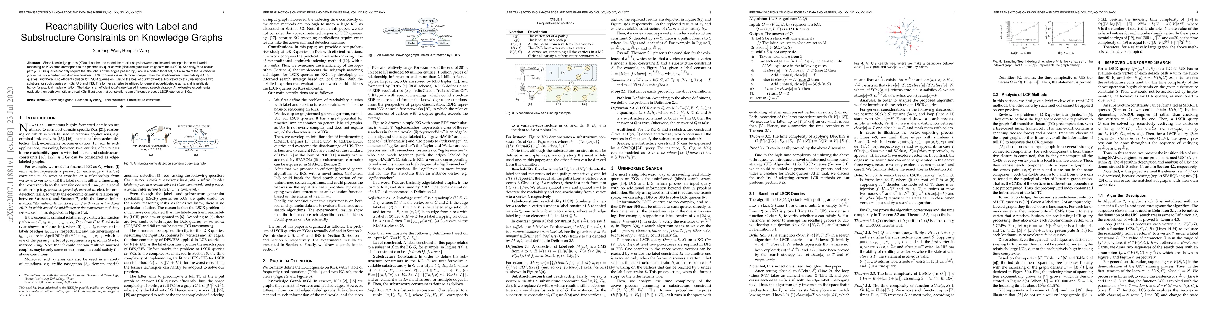 This paper introduces two solutions, UIS and INS, for efficiently processing reachability queries with label and substructure constraints (LSCR) on knowledge graphs. While UIS is practical and applicable to general edge-labeled graphs, INS is a more efficient local-index-based informed search strategy specifically for knowledge graphs, as demonstrated by extensive experimental evaluation.