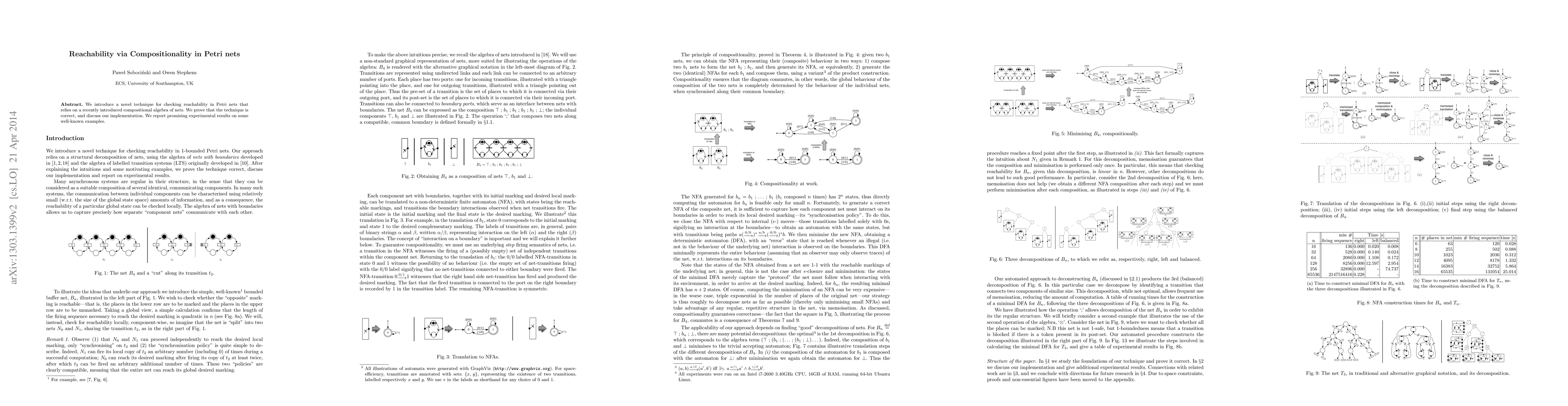 This paper presents a new compositional technique for verifying reachability in Petri nets using a recently developed compositional algebra. The authors demonstrate the correctness of the method and report positive experimental outcomes on standard examples.
