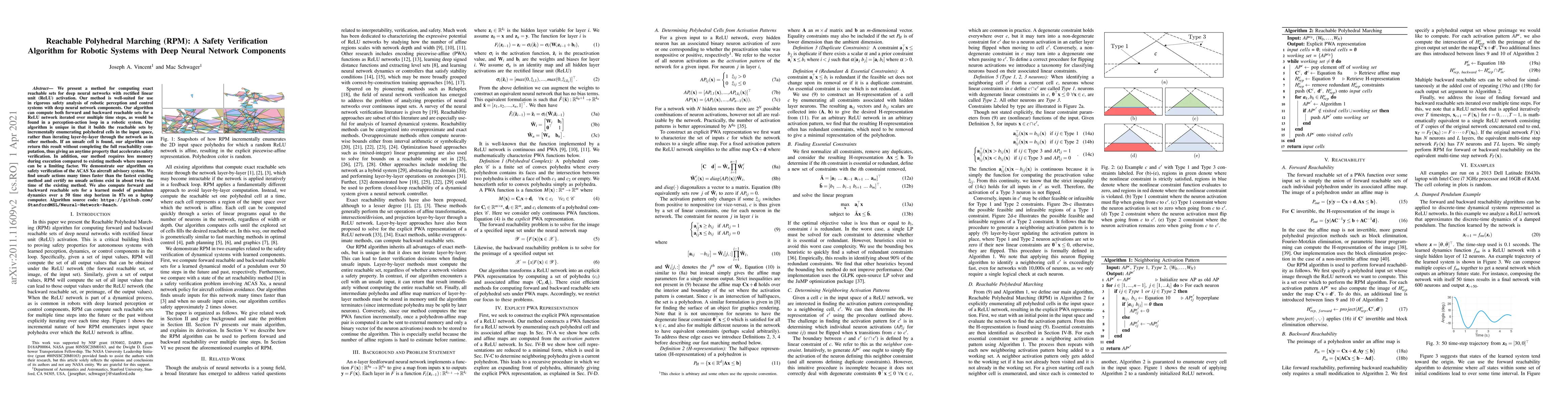 The Reachable Polyhedral Marching (RPM) algorithm computes exact reachable sets for deep neural networks with ReLU activations, enabling rigorous safety analysis in robotic systems. It incrementally builds polyhedral cells in the input space, offering anytime property and reduced memory usage, and demonstrates faster unsafe action detection in the ACAS Xu system compared to existing methods.