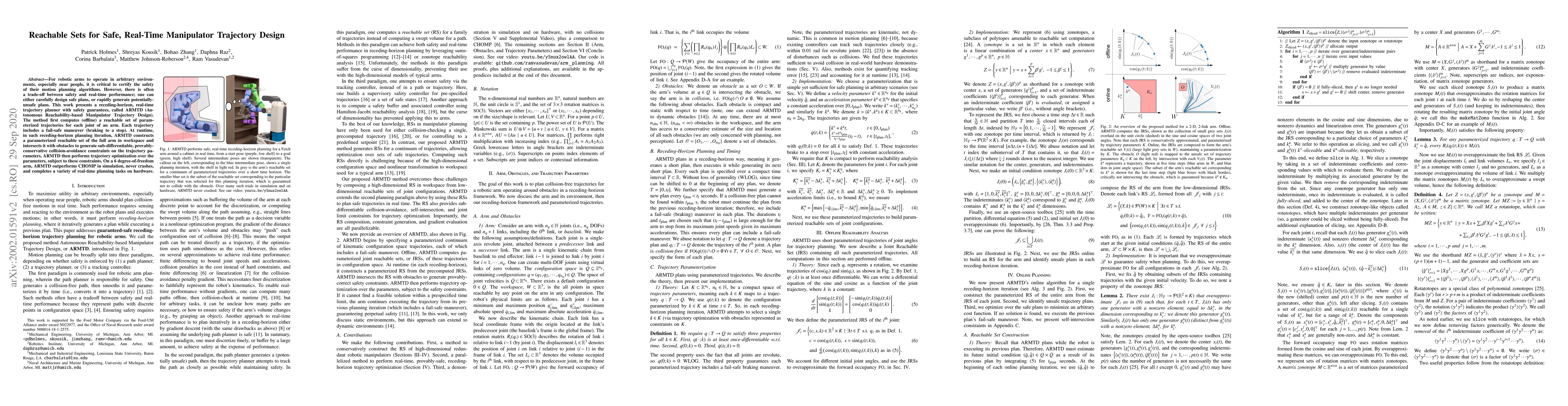 For robotic arms to operate in arbitrary environments, especially near people, it is critical to certify the safety of their motion planning algorithms. However, there is often a trade-off between safety and real-time performance; one can either carefully design safe plans, or rapidly generate potentially-unsafe plans. This work presents a receding-horizon, real-time trajectory planner with safety guarantees, called ARMTD (Autonomous Reachability-based Manipulator Trajectory Design). The method first computes (offline) a reachable set of parameterized trajectories for each joint of an arm. Each trajectory includes a fail-safe maneuver (braking to a stop). At runtime, in each receding-horizon planning iteration, ARMTD constructs a parameterized reachable set of the full arm in workspace and intersects it with obstacles to generate sub-differentiable, provably-conservative collision-avoidance constraints on the trajectory parameters. ARMTD then performs trajectory optimization over the parameters, subject to these constraints. On a 6 degree-of-freedom arm, ARMTD outperforms CHOMP in simulation, never crashes, and completes a variety of real-time planning tasks on hardware.
