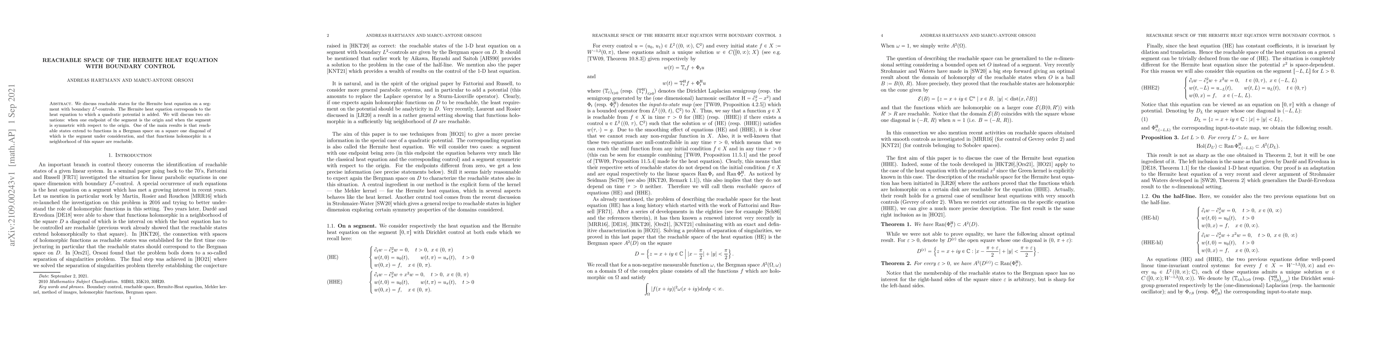 The paper investigates reachable states for the Hermite heat equation with L^2 boundary controls on a segment, showing that functions in a Bergman space can be reached and holomorphic functions near a square diagonal can be controlled.