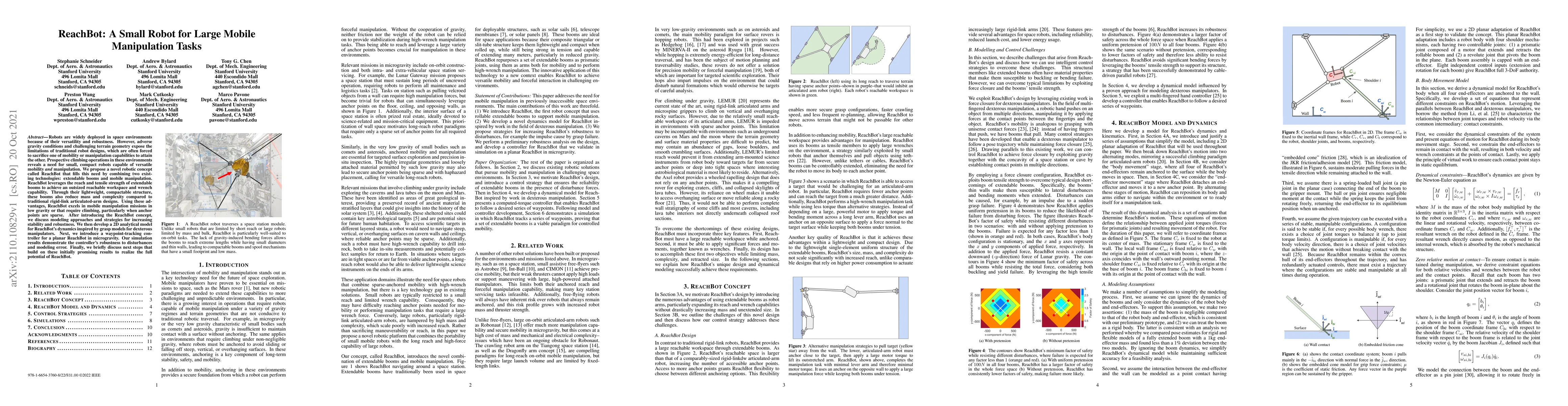 The ReachBot is a novel small robot designed for large mobile manipulation tasks in challenging environments, combining extendable booms with mobile manipulation to achieve a versatile, lightweight, and compact design. Simulation results show its robustness in microgravity, paving the way for future enhancements to fully realize its potential.