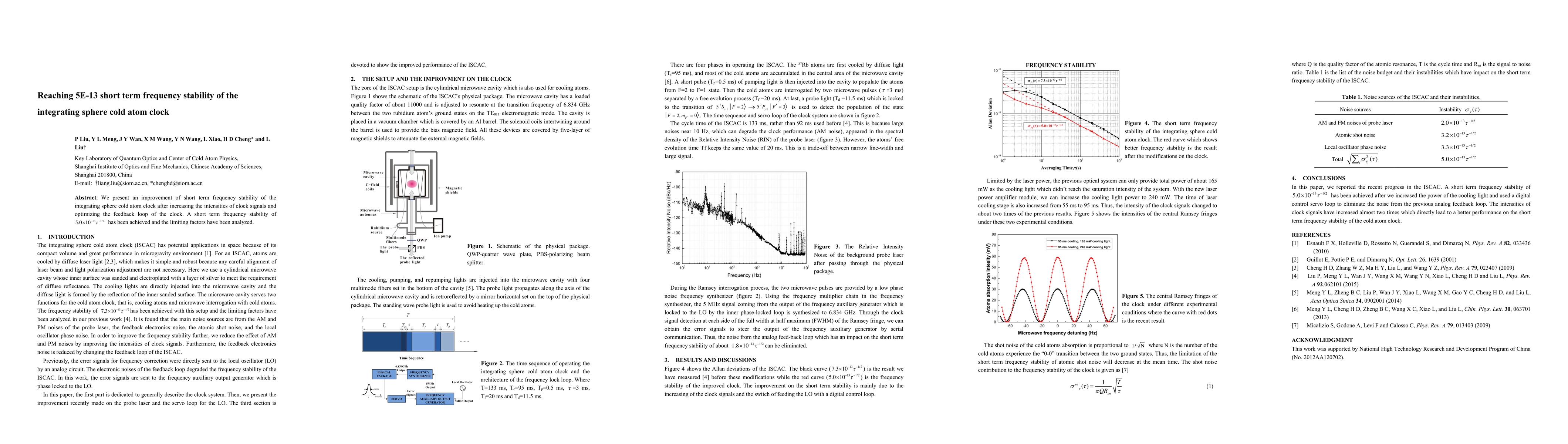 This paper reports an enhancement in the short term frequency stability of the integrating sphere cold atom clock to $5.0\times10^{-13}\tau^{-1/2}$ by boosting clock signal intensities and refining the feedback loop. The study also analyzes the factors limiting further improvements.