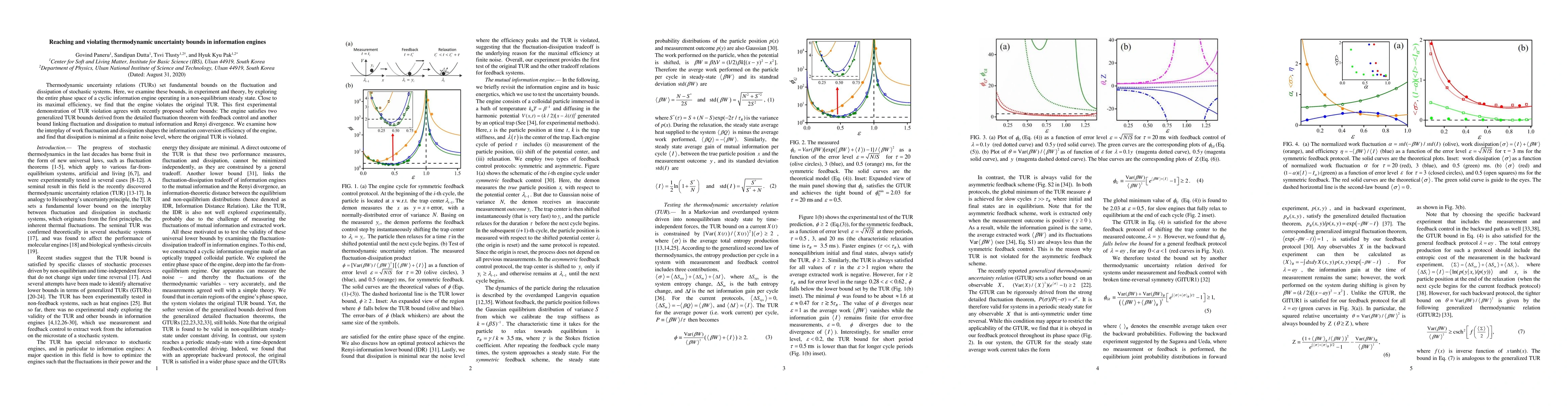 This paper experimentally and theoretically investigates a cyclic information engine's performance near maximal efficiency, demonstrating the first violation of thermodynamic uncertainty relations (TURs). The engine adheres to newly proposed generalized TUR bounds, revealing that dissipation is minimized at a finite noise level where the original TUR is breached.