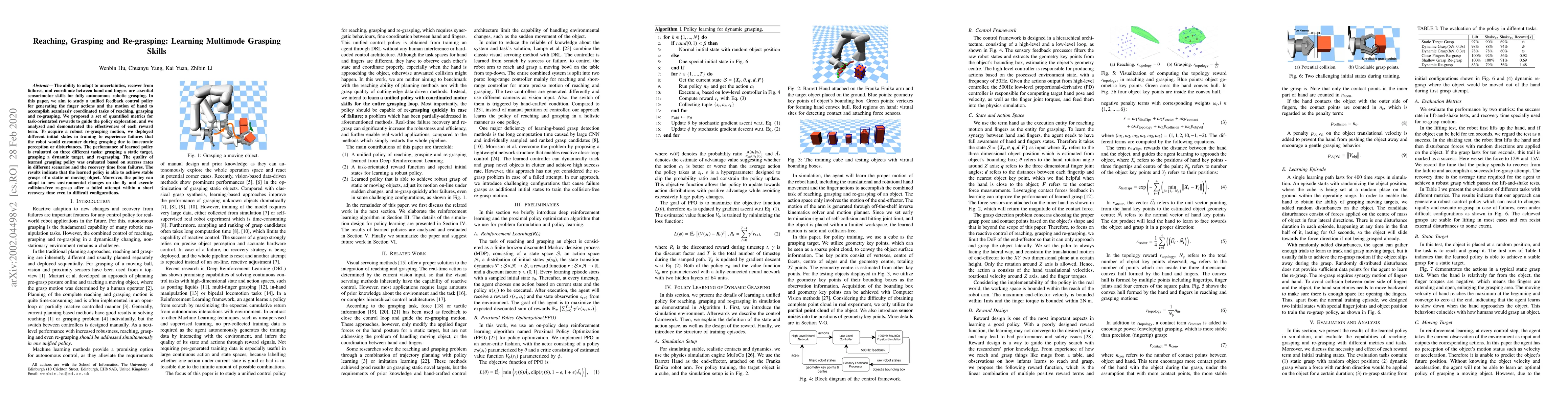 This paper develops a unified feedback control policy for robotic grasping that coordinates reaching, grasping, and re-grasping. The policy is trained using quantified metrics for task-oriented rewards and demonstrates success in grasping static and dynamic objects, as well as efficient re-grasping after failures.