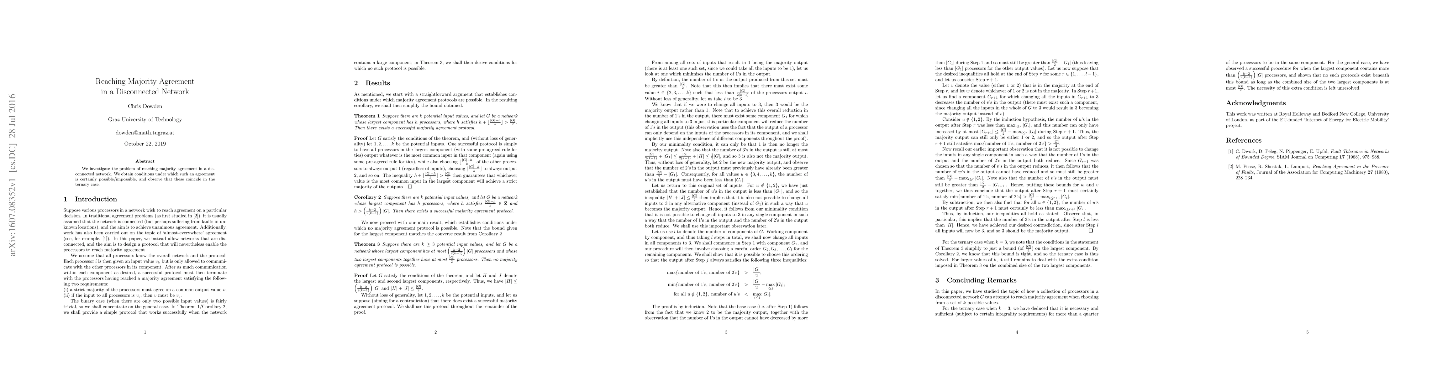 We investigate the problem of reaching majority agreement in a disconnected network. We obtain conditions under which such an agreement is certainly possible/impossible, and observe that these coincide in the ternary case.