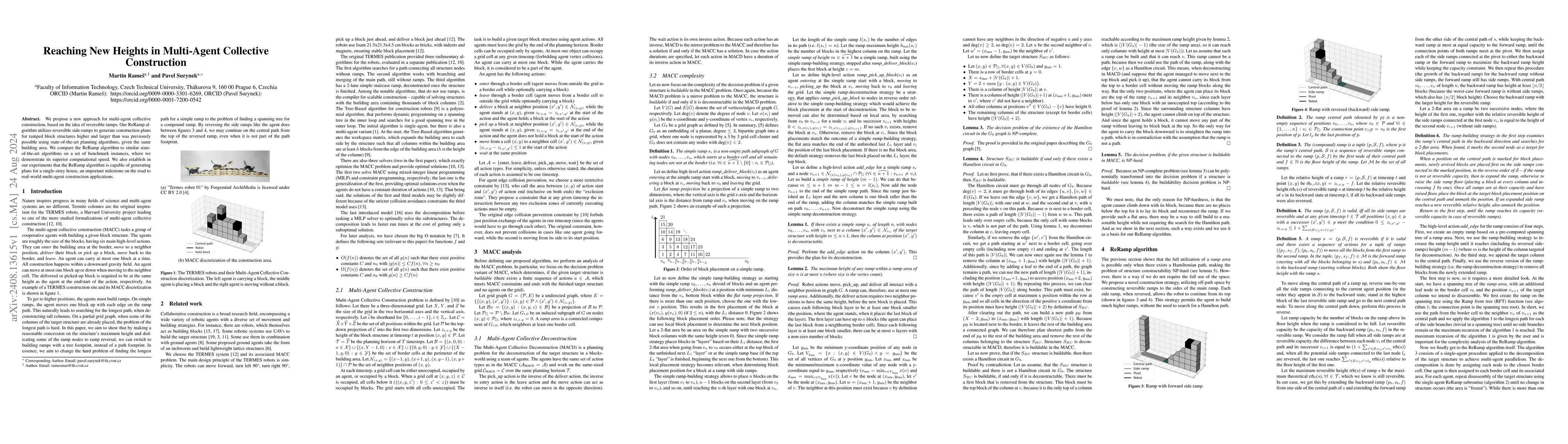 The ReRamp algorithm introduces reversible side-ramps for multi-agent collective construction, achieving higher and larger structures faster than state-of-the-art methods, and successfully generating plans for a single-story house.