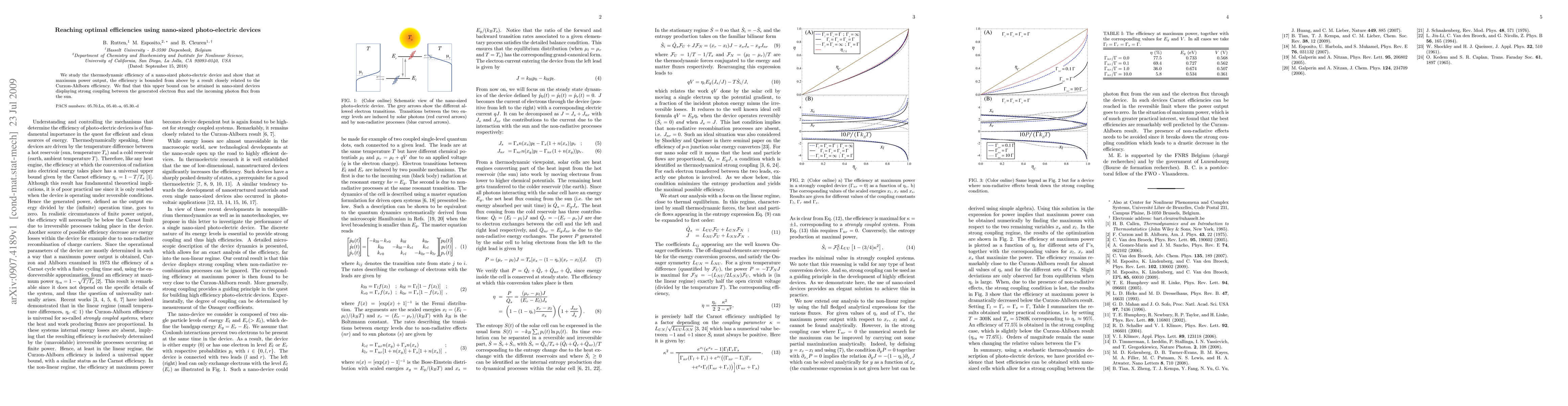Researchers studied the efficiency of nano-sized photo-electric devices and found that their performance is limited by an upper bound related to Curzon-Ahlborn efficiency, but optimal performance can be achieved in strongly coupled devices.
