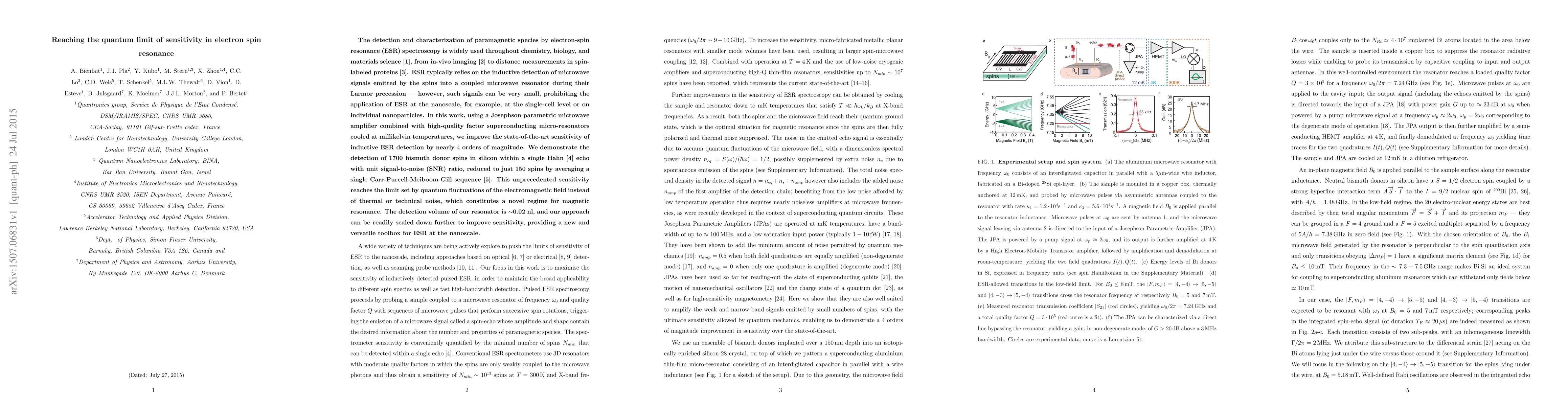 This paper reports a significant enhancement in the sensitivity of pulsed electron-spin resonance (ESR) detection, achieving nearly 4 orders of magnitude improvement using a Josephson parametric amplifier and superconducting micro-resonators. The study demonstrates the detection of 1,700 bismuth donor spins in silicon, reaching the quantum limit of sensitivity beyond thermal or technical noise.