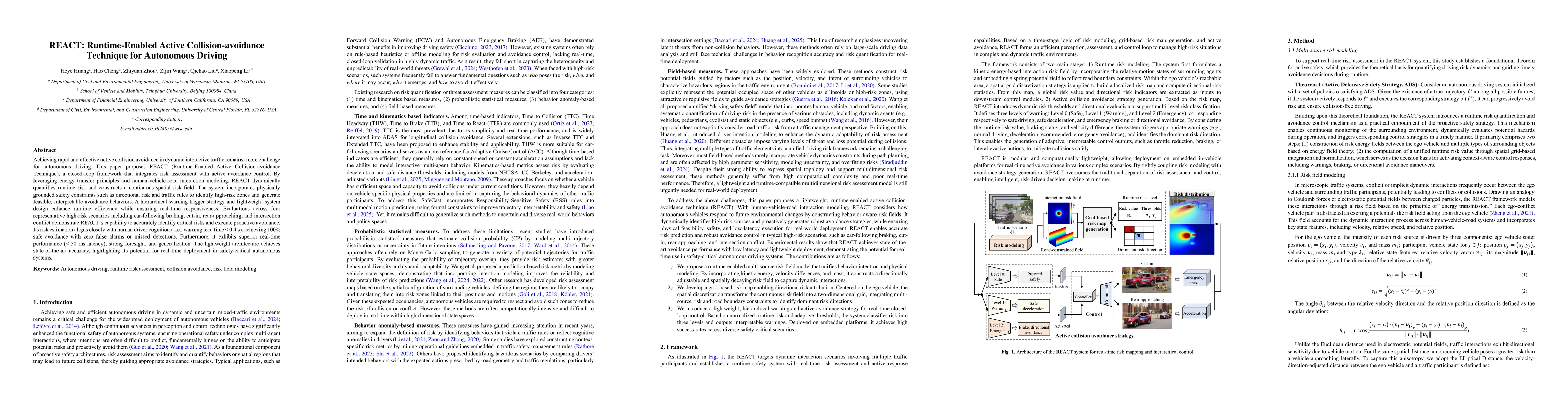 The paper proposes REACT, a closed-loop framework for active collision avoidance in autonomous driving that integrates risk assessment with active avoidance control using energy transfer principles and human-vehicle-road interaction modeling.