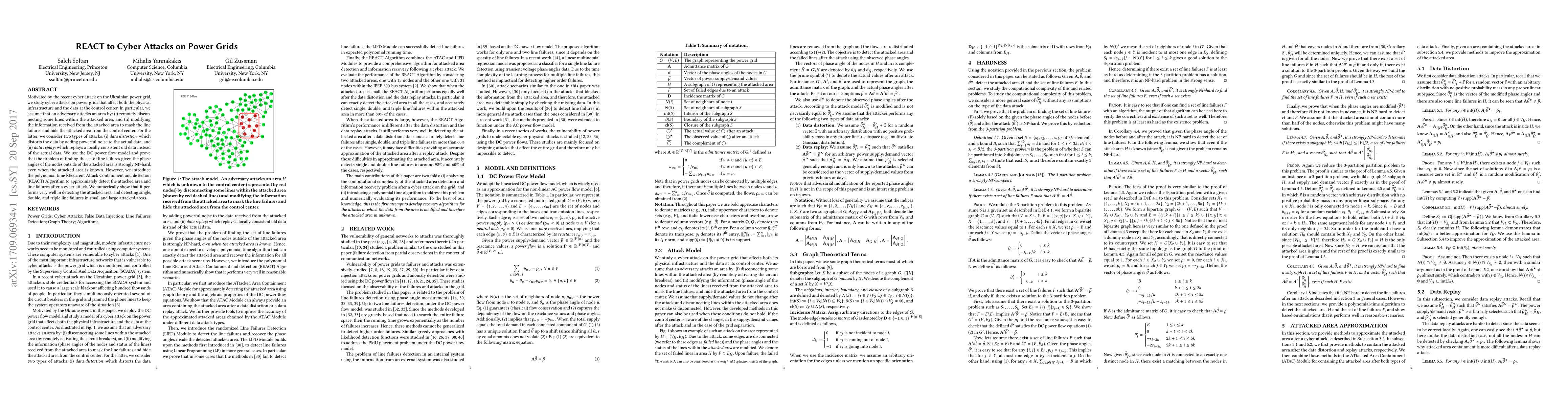 Motivated by the recent cyber attack on the Ukrainian power grid, we study cyber attacks on power grids that affect both the physical infrastructure and the data at the control center. In particular, we assume that an adversary attacks an area by: (i) remotely disconnecting some lines within the attacked area, and (ii) modifying the information received from the attacked area to mask the line failures and hide the attacked area from the control center. For the latter, we consider two types of attacks: (i) data distortion: which distorts the data by adding powerful noise to the actual data, and (ii) data replay: which replays a locally consistent old data instead of the actual data. We use the DC power flow model and prove that the problem of finding the set of line failures given the phase angles of the nodes outside of the attacked area is strongly NP-hard, even when the attacked area is known. However, we introduce the polynomial time REcurrent Attack Containment and deTection (REACT) Algorithm to approximately detect the attacked area and line failures after a cyber attack. We numerically show that it performs very well in detecting the attacked area, and detecting single, double, and triple line failures in small and large attacked areas.