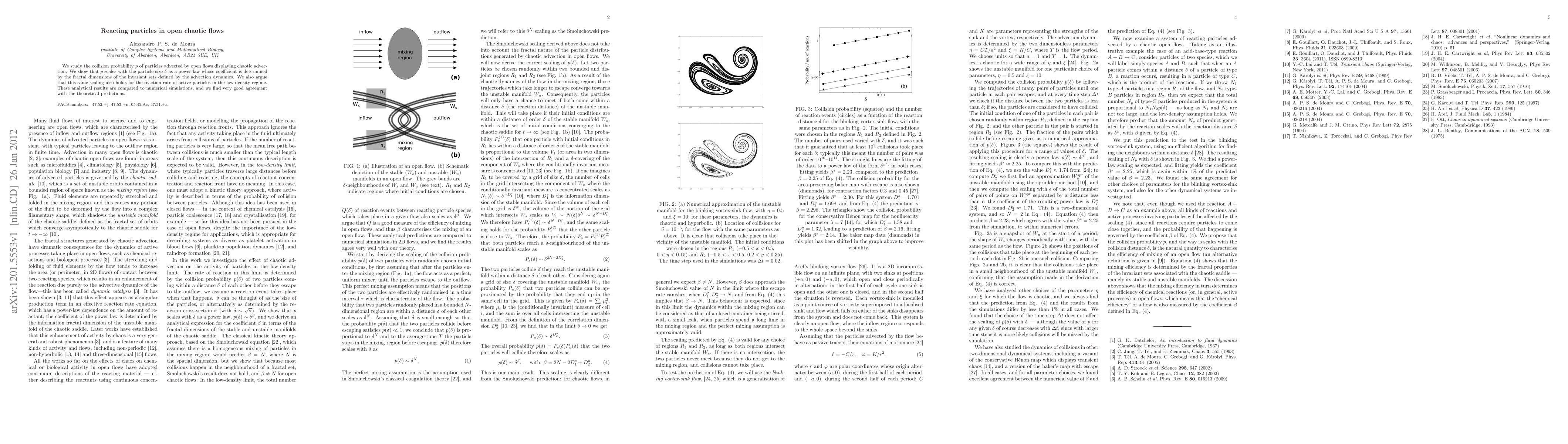 The paper investigates the collision probability of particles in chaotic open flows, demonstrating a power-law scaling with particle size, influenced by the fractal dimensions of invariant sets. Analytical results show good agreement with numerical simulations, extending to the reaction rate of active particles in low-density regimes.