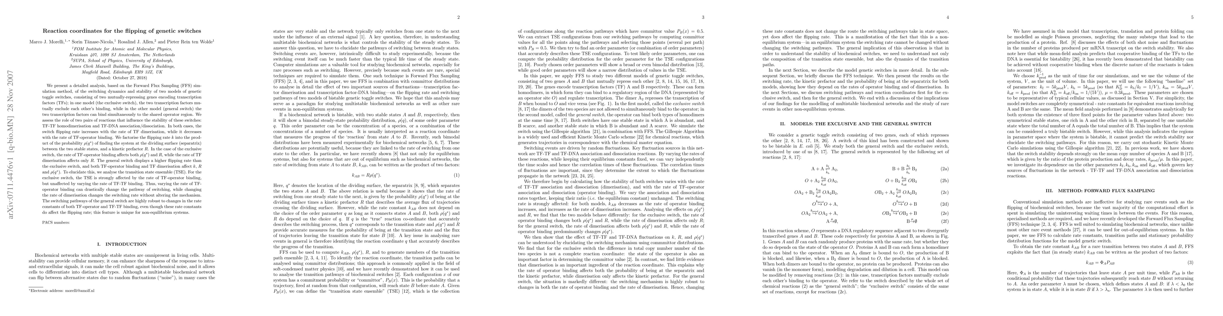 Researchers analyzed genetic switch models using Forward Flux Sampling to understand switching dynamics and stability. They found that specific reaction rates affect the system's behavior, with some switches showing robustness to changes in rate constants.