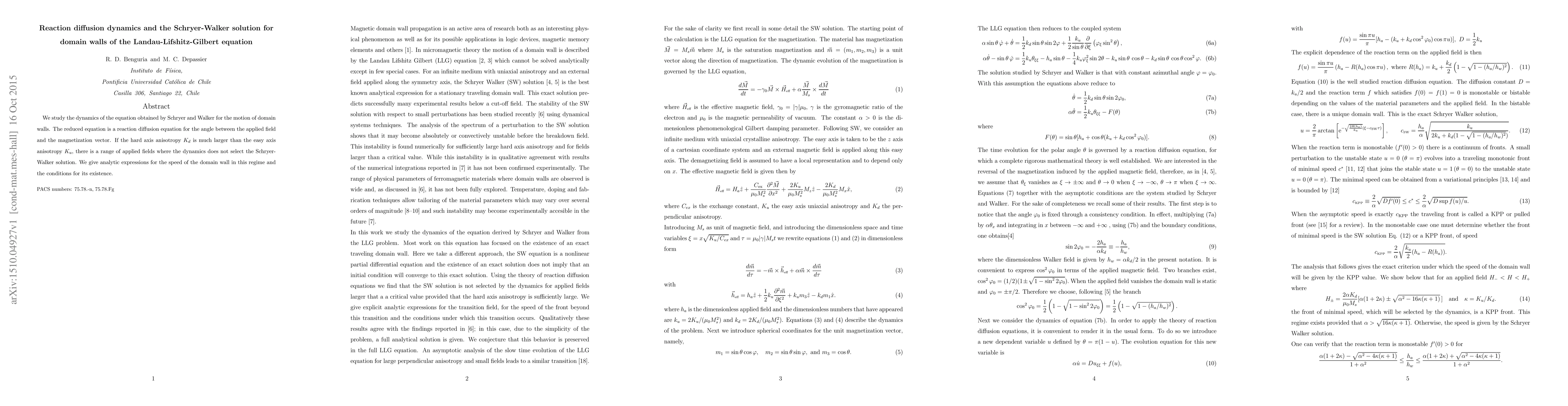 We study the dynamics of the equation obtained by Schryer and Walker for the motion of domain walls. The reduced equation is a reaction diffusion equation for the angle between the applied field and the magnetization vector. If the hard axis anisotropy $K_d$ is much larger than the easy axis anisotropy $K_u$, there is a range of applied fields where the dynamics does not select the Schryer-Walker solution. We give analytic expressions for the speed of the domain wall in this regime and the conditions for its existence.