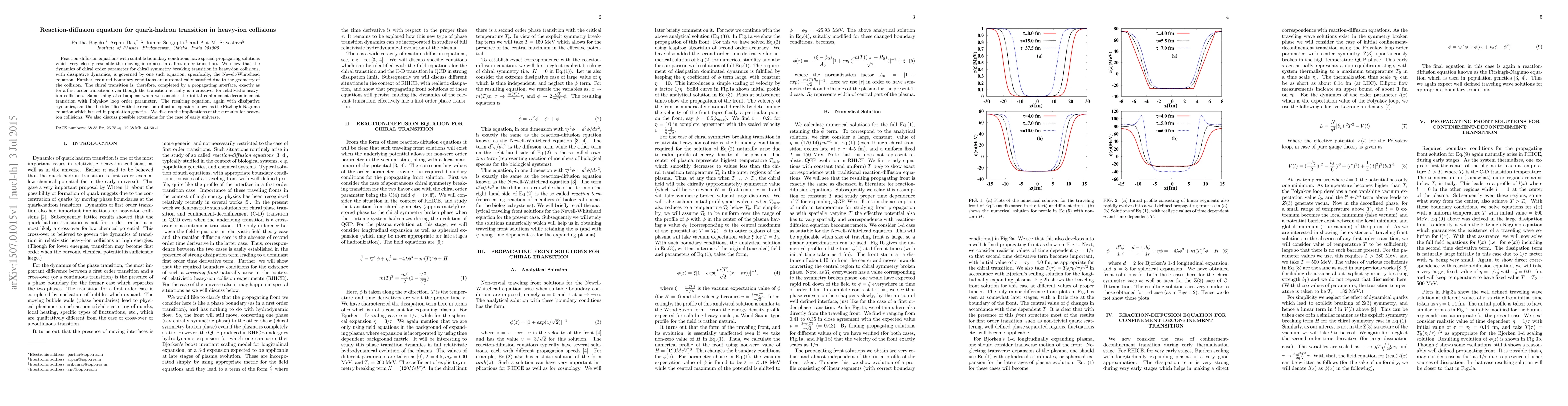This paper demonstrates that the dynamics of chiral symmetry breaking and confinement-deconfinement transitions in heavy-ion collisions can be described by reaction-diffusion equations, specifically the Newell-Whitehead and Fitzhugh-Nagumo equations, which model propagating interfaces akin to first-order phase transitions. The study highlights the implications for understanding these transitions and suggests potential extensions to early universe scenarios.