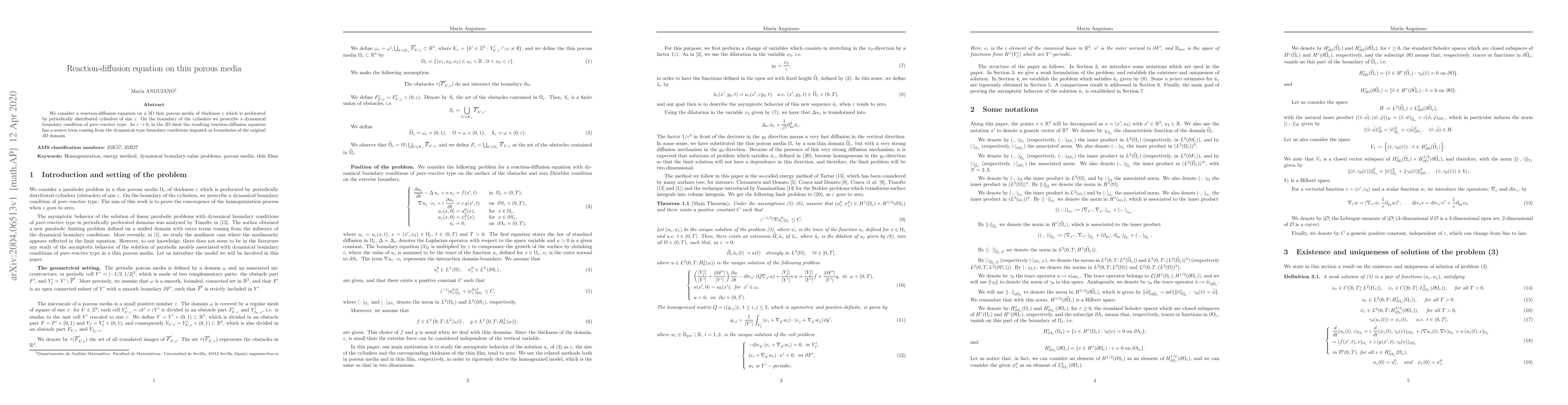 This paper studies a reaction-diffusion equation on thin 3D porous media perforated by cylinders, focusing on the behavior as the thickness approaches zero. The boundary of the cylinders imposes a reactive condition, leading to a source term in the resulting 2D reaction-diffusion equation.