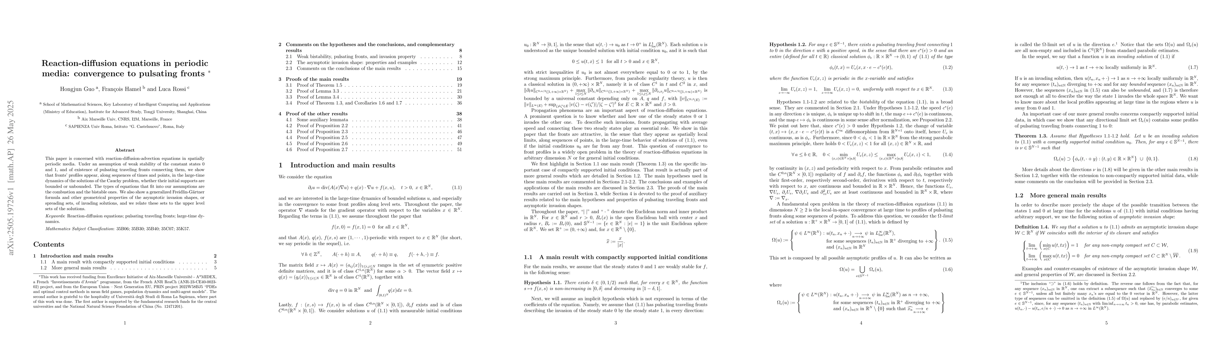 The paper investigates reaction-diffusion-advection equations in spatially periodic media, focusing on weak stability of constant states 0 and 1, and existence of pulsating traveling fronts.