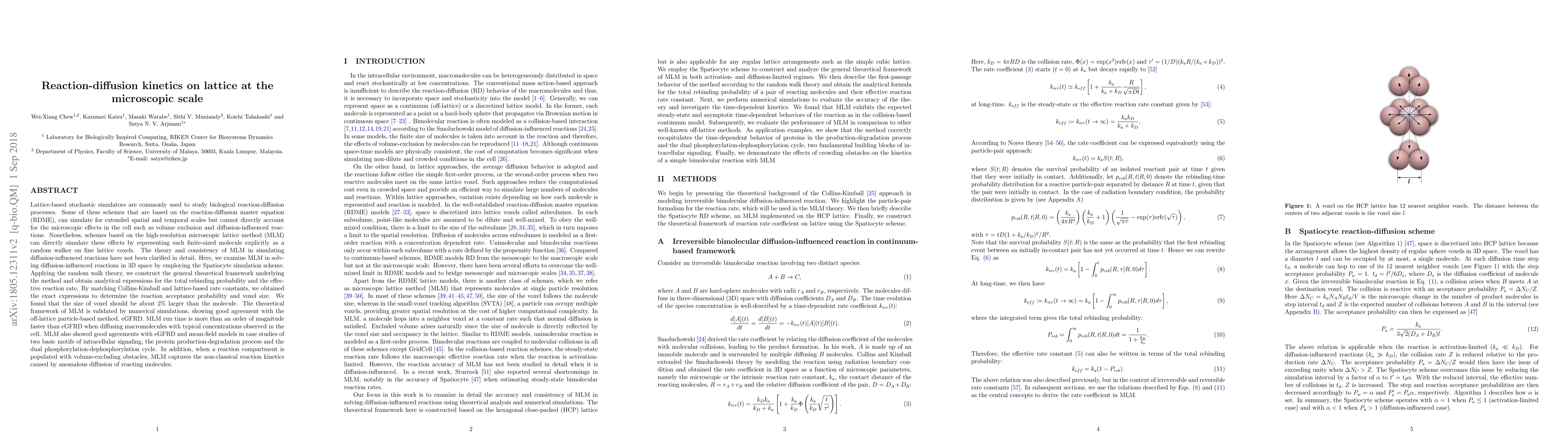 This paper investigates the high-resolution microscopic lattice method (MLM) for simulating diffusion-influenced reactions in 3D space, providing a detailed theoretical framework and analytical expressions for reaction rates. MLM is shown to accurately capture microscopic effects and is significantly faster than traditional particle-based methods, demonstrating its effectiveness in intracellular signaling processes.