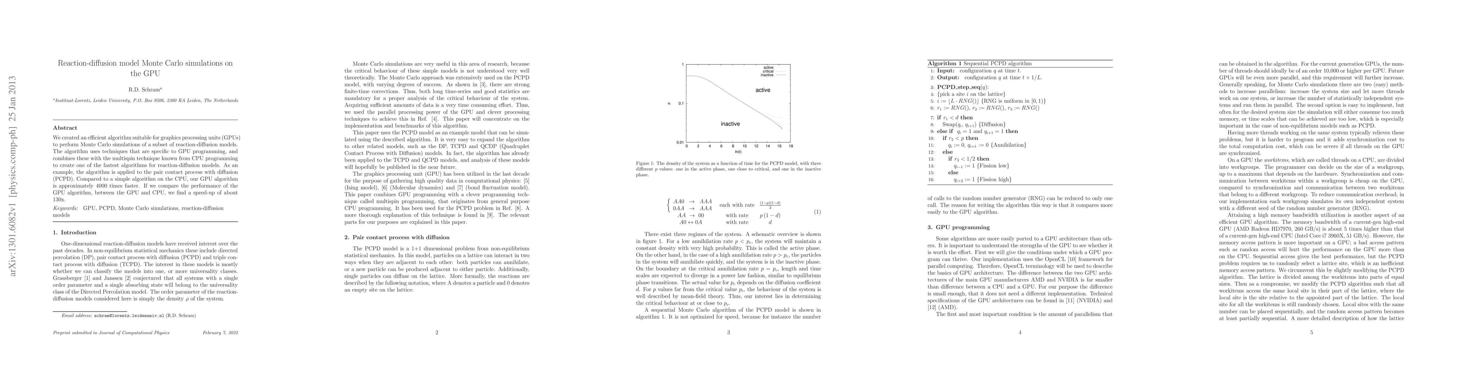 We created an efficient algorithm suitable for graphics processing units (GPUs) to perform Monte Carlo simulations of a subset of reaction-diffusion models. The algorithm uses techniques that are specific to GPU programming, and combines these with the multispin technique known from CPU programming to create one of the fastest algorithms for reaction-diffusion models. As an example, the algorithm is applied to the pair contact process with diffusion (PCPD). Compared to a simple algorithm on the CPU, our GPU algorithm is approximately 4000 times faster. If we compare the performance of the GPU algorithm, between the GPU and CPU, we find a speed-up of about 130x.
