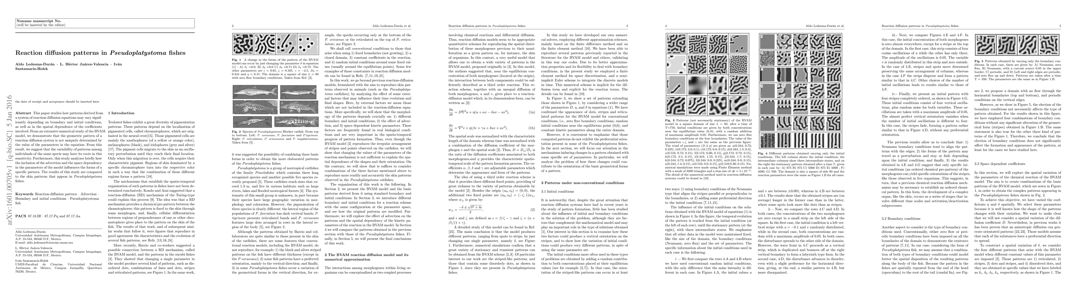 This paper investigates the variability of reaction-diffusion patterns in Pseudoplatystoma fishes, demonstrating that pattern formation is sensitive to boundary and initial conditions, as well as spatial dependencies. The study suggests that this sensitivity may explain the variability in patterns among individuals of the same species.