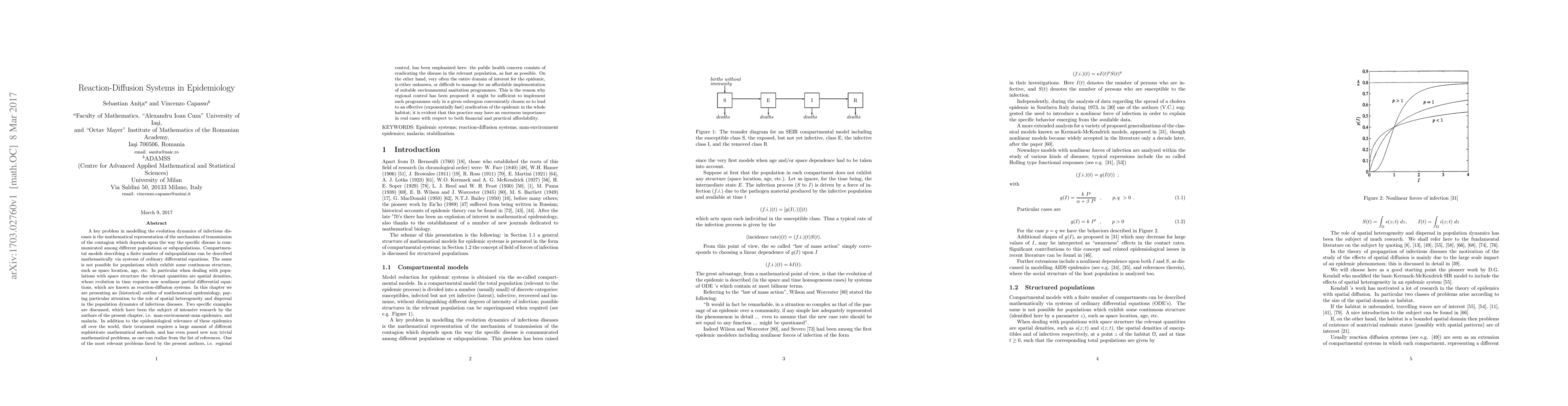 This paper outlines the mathematical modeling of infectious diseases using reaction-diffusion systems, focusing on the role of spatial heterogeneity in population dynamics. It discusses specific examples like man-environment-man epidemics and malaria, emphasizing regional control strategies for effective and affordable disease eradication.