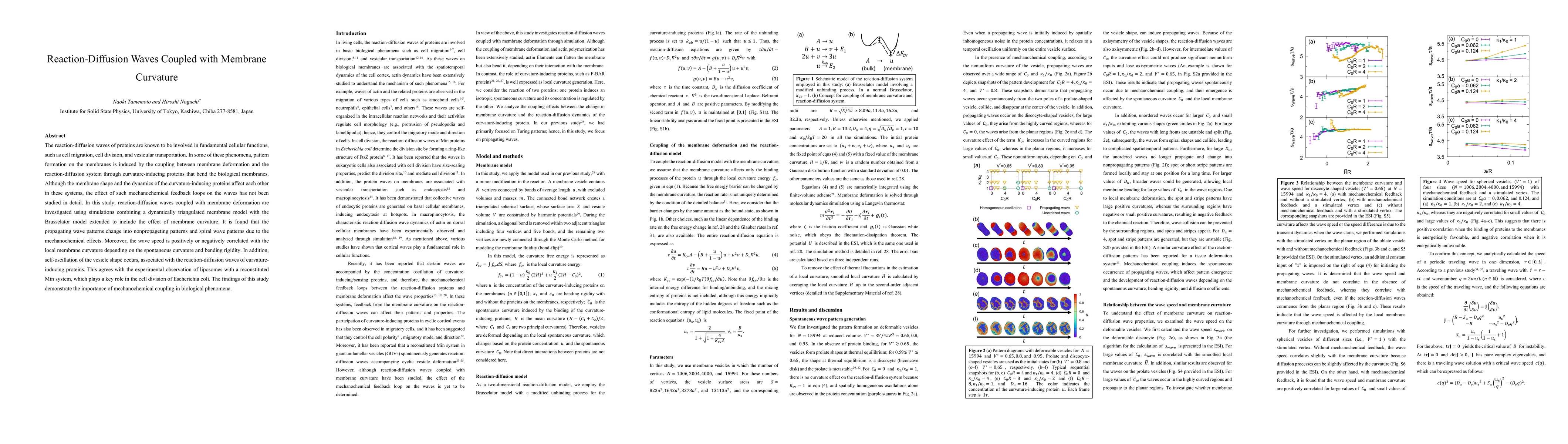 This study investigates the impact of mechanochemical feedback loops on reaction-diffusion waves using simulations that couple a dynamically triangulated membrane model with an extended Brusselator model. The findings reveal that the waves transform into nonpropagating and spiral patterns due to mechanochemical effects, with wave speed correlating with local membrane curvature.