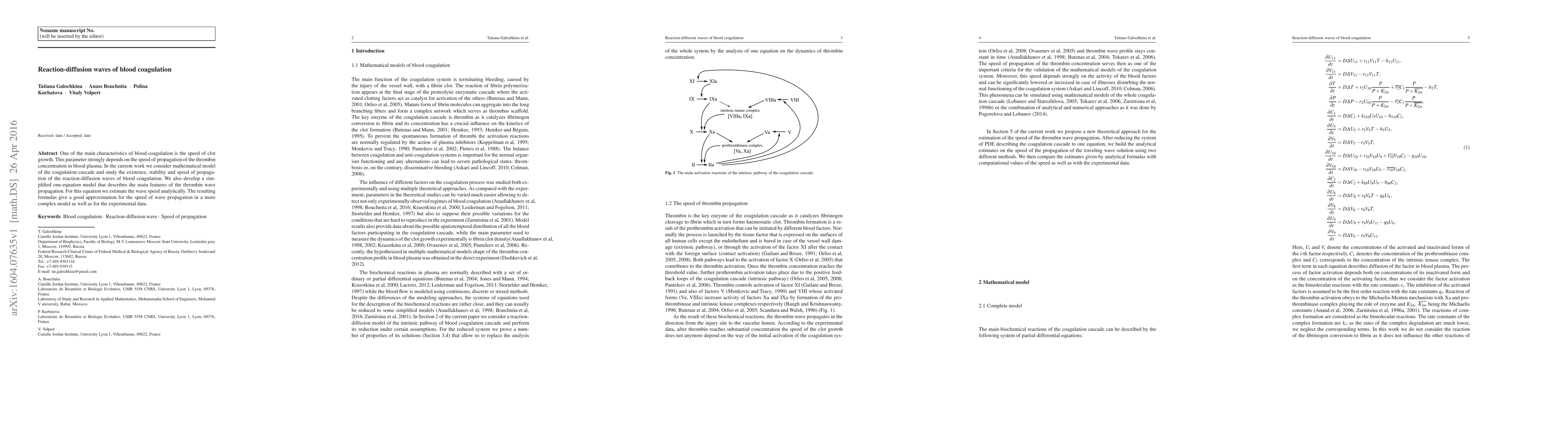 Researchers studied blood coagulation waves using a simplified model, finding that thrombin concentration propagation speed affects clot growth and estimating wave speeds through analytical formulas that accurately approximate experimental data.