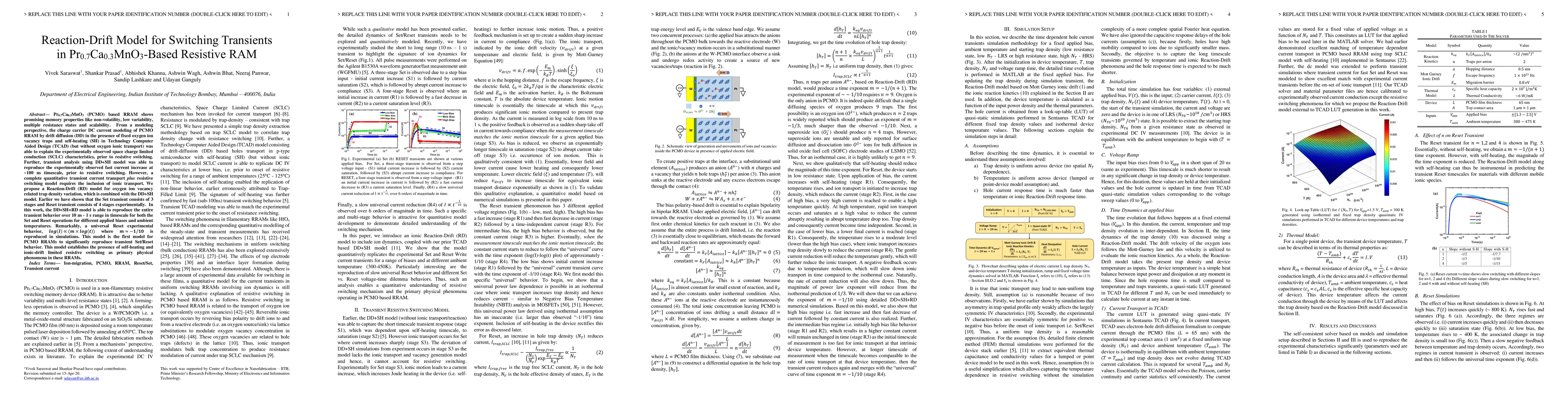 The paper proposes a Reaction-Drift (RD) model combined with drift-diffusion and self-heating to accurately model the transient resistive switching behavior in Pr$_{0.7}$Ca$_{0.3}$MnO$_3$-based Resistive RAM (RRAM). The model successfully reproduces the experimentally observed transient current behavior across a wide timescale, confirming self-heating and ionic-drift as key mechanisms.