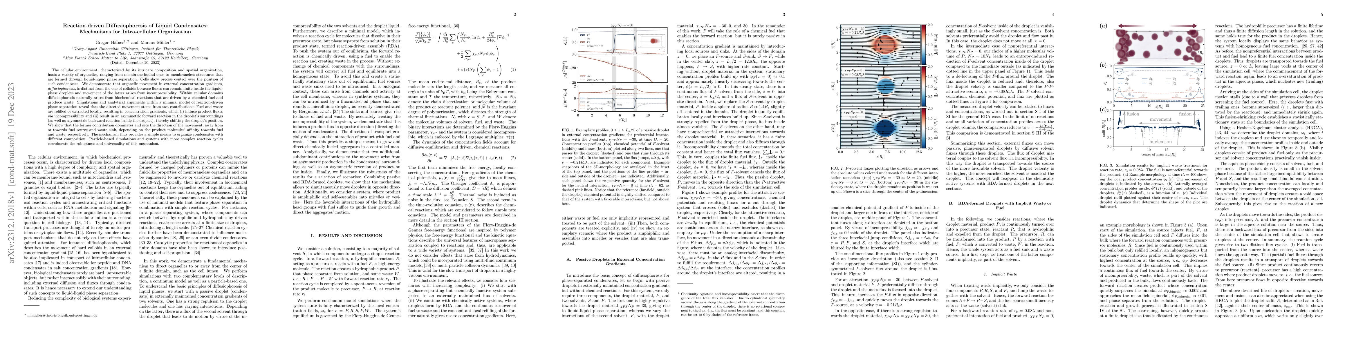 The paper presents a detailed theoretical framework for understanding reaction-driven diffusiophoresis of liquid condensates, distinguishing it from colloid diffusiophoresis and highlighting the role of incompressibility and asymmetric reactions.