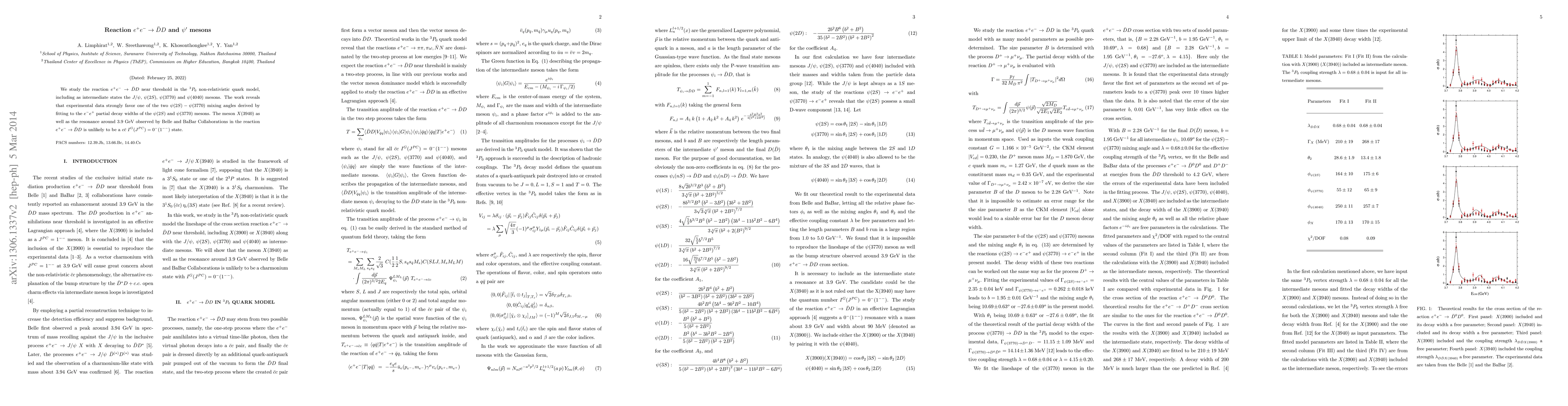 We study the reaction $e^+e^-\to\bar DD$ near threshold in the $^3P_0$ non-relativistic quark model, including as intermediate states the $J/\psi$, $\psi(2S)$, $\psi(3770)$ and $\psi(4040)$ mesons. The work reveals that experimental data strongly favor one of the two $\psi(2S)-\psi(3770)$ mixing angles derived by fitting to the $e^-e^+$ partial decay widths of the $\psi(2S)$ and $\psi(3770)$ mesons. The meson $X(3940)$ as well as the resonance around 3.9 GeV observed by Belle and BaBar Collaborations in the reaction $e^+e^-\rightarrow \bar DD$ is unlikely to be a $c\bar c$ $I^G(J^{PC})=0^-(1^{--})$ state.