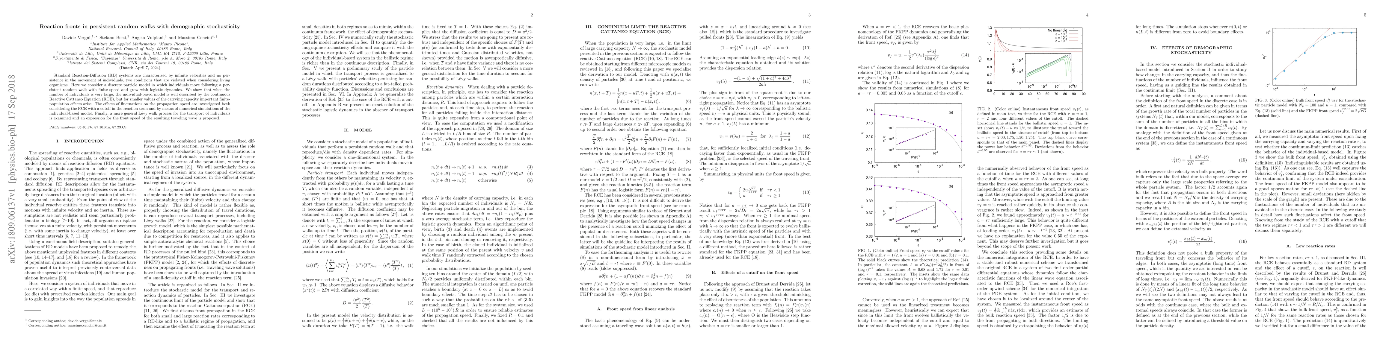 A study investigates how living organisms move and interact in a reaction-diffusion system, finding that for large populations, the behavior is described by a simplified equation, but smaller populations show significant effects due to fluctuations and population size.