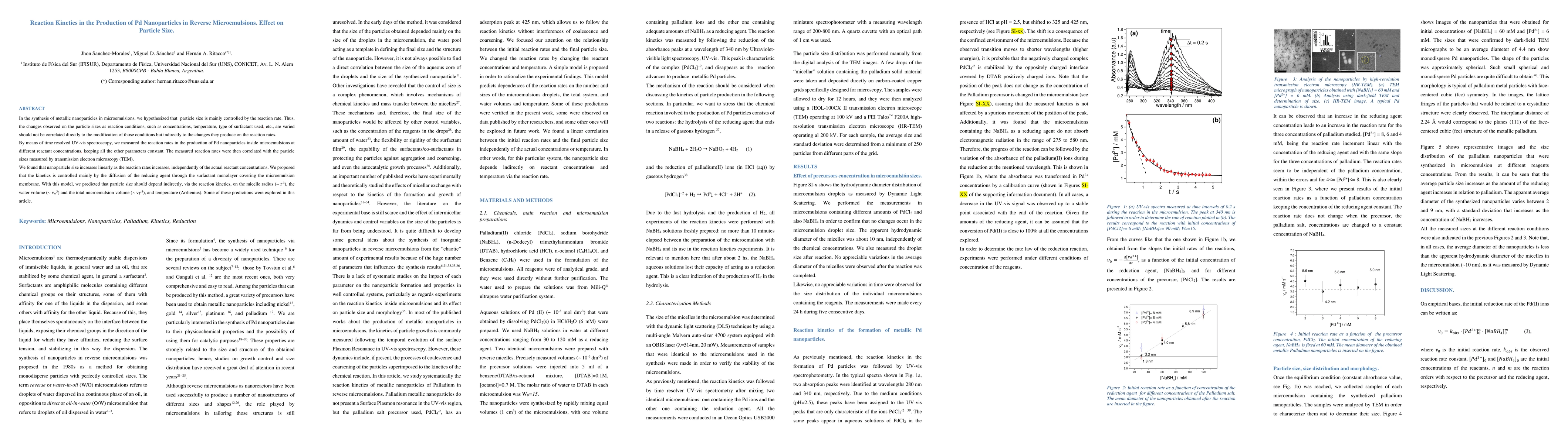 This study explores the relationship between reaction kinetics and particle size in Pd nanoparticle production within microemulsions. Utilizing time-resolved UV-vis spectroscopy, it was discovered that nanoparticle size increases with rising reaction rates, irrespective of reactant concentrations. The kinetics are proposed to be primarily governed by the diffusion of the reducing agent through the surfactant monolayer. Predictions based on this model, considering factors like micelle radius, water volume, total microemulsion volume, and temperature, were partially validated.