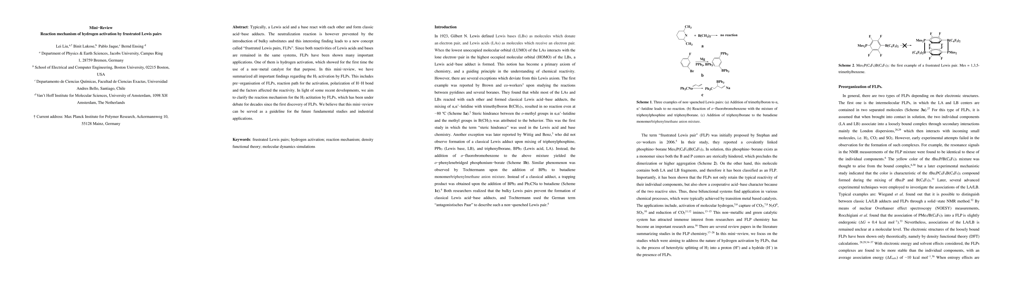 Typically, a Lewis acid and a base react with each other and form classic acid base adducts. The neutralization reaction is however prevented by the introduction of bulky substitutes and this interesting finding leads to a new concept called frustrated Lewis pairs, FLPs. Since both reactivities of Lewis acids and bases are remained in the same systems, FLPs have been shown many important applications. One of them is hydrogen activation, which showed for the first time the use of a non metal catalyst for that purpose. In this mini review, we have summarized all important findings regarding the H2 activation by FLPs. This includes preorganisation of FLPs, reaction path for the activation, polarization of HH bond and the factors affected the reactivity. In light of some recent developments, we aim to clarify the reaction mechanism for the H2 actitation by FLPs, which has been under debate for decades since the first discovery of FLPs. We believe that this mini review can be served as a guideline for the future fundamental studies and industrial applications.