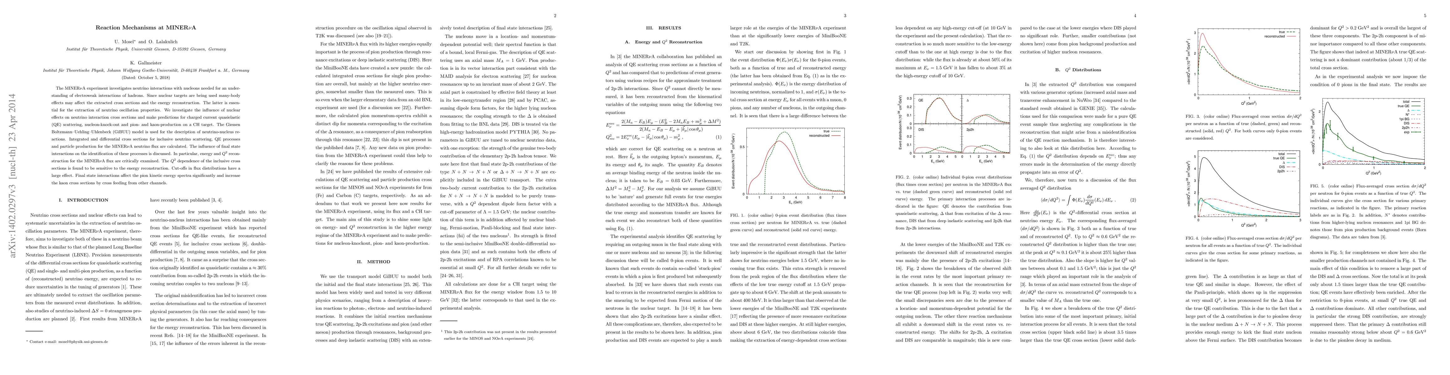 The MINER$\nu$A experiment studies neutrino interactions with nucleons to understand electroweak interactions, focusing on the impact of nuclear effects on extracted cross sections and energy reconstruction. The GiBUU model predicts various neutrino scattering processes on a CH target, highlighting the influence of final state interactions on energy and $Q^2$ reconstruction, and the significant effect of cut-offs in flux distributions on inclusive cross sections.