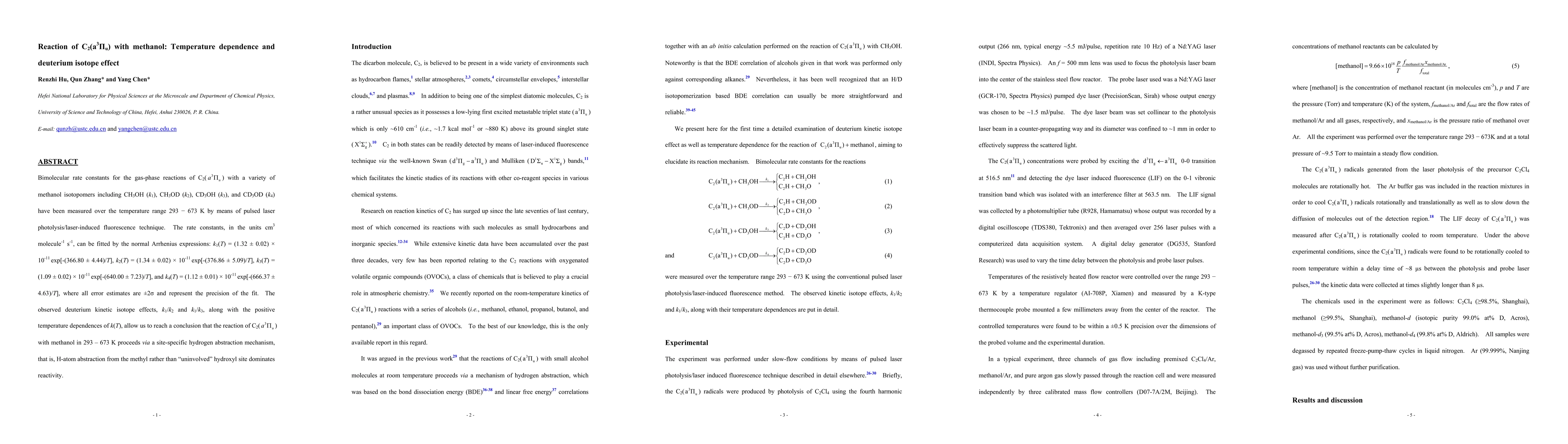 Summary: This study investigates the temperature dependence and kinetic isotope effect of the reaction between C_2(a^3Pi_u) and methanol. The findings reveal a site-specific hydrogen abstraction from the methyl site, rather than the hydroxyl site, based on the observed positive temperature dependence and deuterium isotope effects.