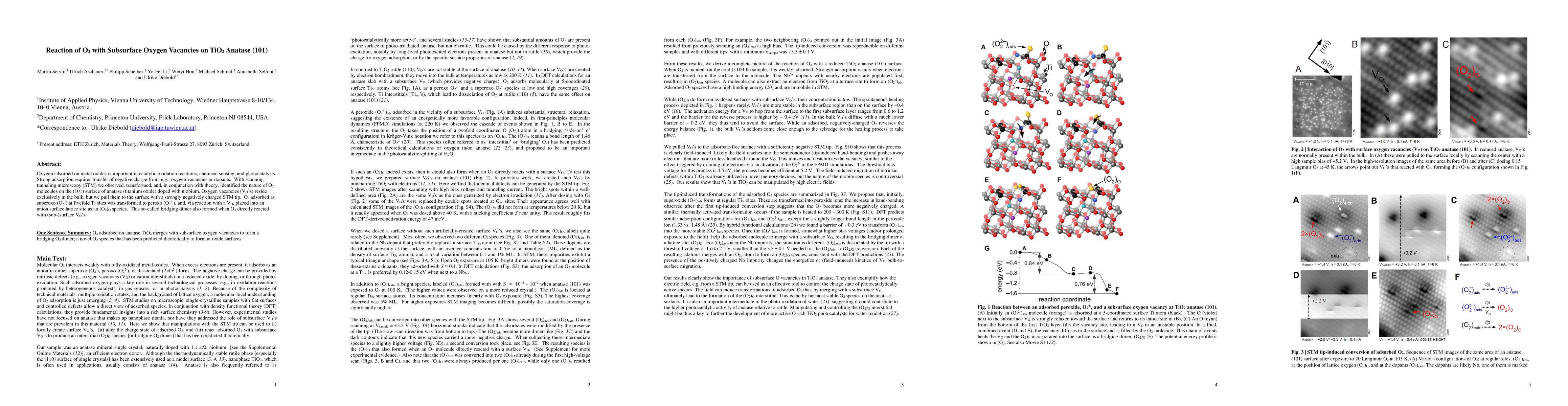 Oxygen (O2) adsorbed on metal oxides is important in catalytic oxidation reactions, chemical sensing, and photocatalysis. Strong adsorption requires transfer of negative charge from oxygen vacancies (VOs) or dopants, for example. With scanning tunneling microscopy, we observed, transformed, and, in conjunction with theory, identified the nature of O2 molecules on the (101) surface of anatase (titanium oxide, TiO2) doped with niobium. VOs reside exclusively in the bulk, but we pull them to the surface with a strongly negatively charged scanning tunneling microscope tip. O2 adsorbed as superoxo (O2)- at fivefold-coordinated Ti sites was transformed to peroxo (O2)2- and, via reaction with a VO, placed into an anion surface lattice site as an (O2)O species. This so-called bridging dimer also formed when O2 directly reacted with VOs at or below the surface.