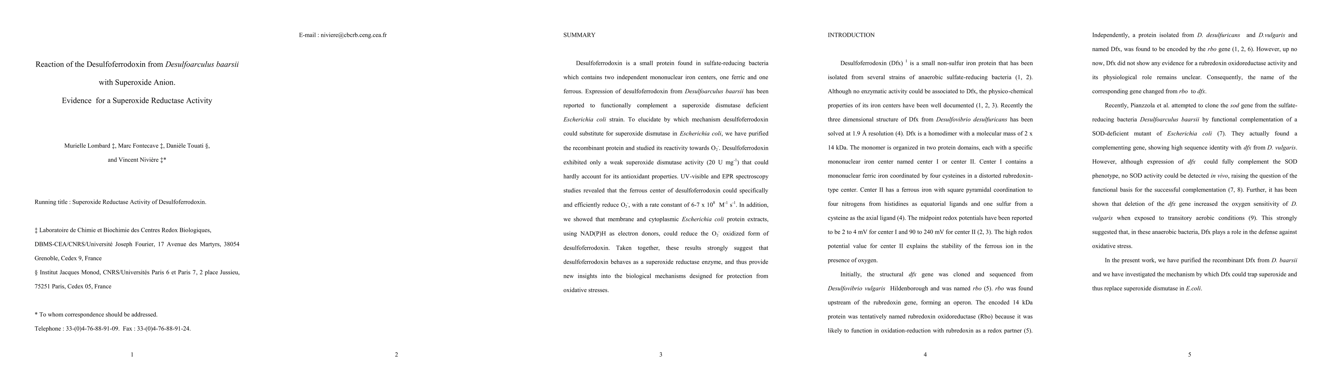 Desulfoferrodoxin from Desulfoarculus baarsii exhibits superoxide reductase activity, reducing superoxide anions efficiently, suggesting it functions as a superoxide reductase rather than a superoxide dismutase, offering new insights into oxidative stress protection mechanisms.
