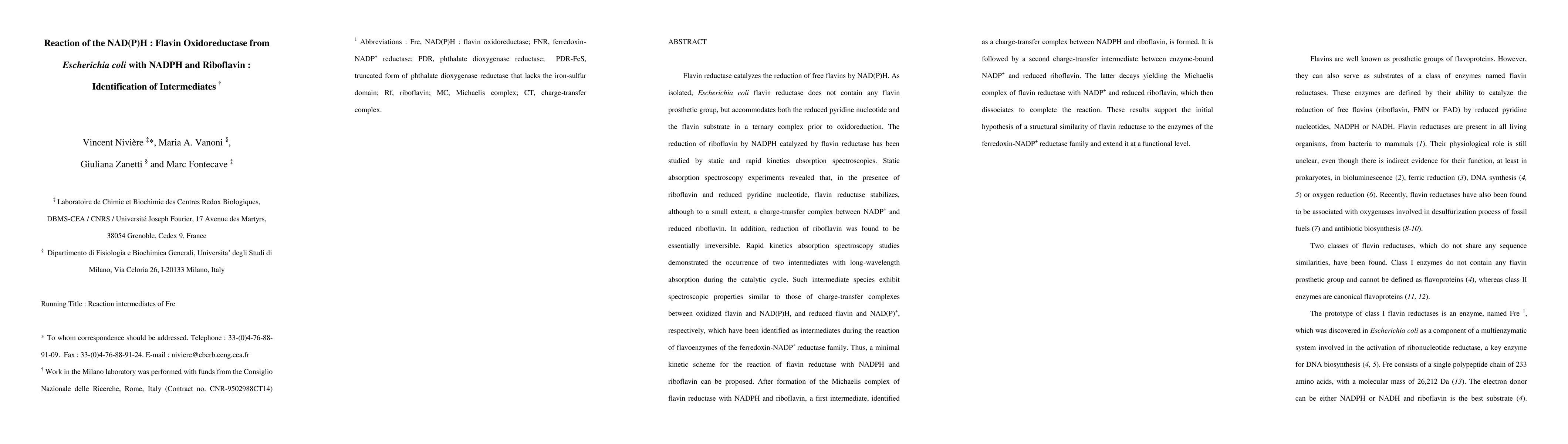 Flavin reductase catalyzes the reduction of free flavins by NAD(P)H. As isolated, Escherichia coli flavin reductase does not contain any flavin prosthetic group but accommodates both the reduced pyridine nucleotide and the flavin substrate in a ternary complex prior to oxidoreduction. The reduction of riboflavin by NADPH catalyzed by flavin reductase has been studied by static and rapid kinetics absorption spectroscopies. Static absorption spectroscopy experiments revealed that, in the presence of riboflavin and reduced pyridine nucleotide, flavin reductase stabilizes, although to a small extent, a charge-transfer complex of NADP+ and reduced riboflavin. In addition, reduction of riboflavin was found to be essentially irreversible. Rapid kinetics absorption spectroscopy studies demonstrated the occurrence of two intermediates with long-wavelength absorption during the catalytic cycle. Such intermediate species exhibit spectroscopic properties similar to those of charge-transfer complexes of oxidized flavin and NAD(P)H, and reduced flavin and NAD(P)+, respectively, which have been identified as intermediates during the reaction of flavoenzymes of the ferredoxin-NADP+ reductase family. Thus, a minimal kinetic scheme for the reaction of flavin reductase with NADPH and riboflavin can be proposed. After formation of the Michaelis complex of flavin reductase with NADPH and riboflavin, a first intermediate, identified as a charge-transfer complex of NADPH and riboflavin, is formed. It is followed by a second charge-transfer intermediate of enzyme-bound NADP+ and reduced riboflavin. The latter decays, yielding the Michaelis complex of flavin reductase with NADP+ and reduced riboflavin, which then dissociates to complete the reaction. These results support the initial hypothesis of a structural similarity between flavin reductase and the enzymes of the ferredoxin-NADP+ reductase family and extend it at a functional level.