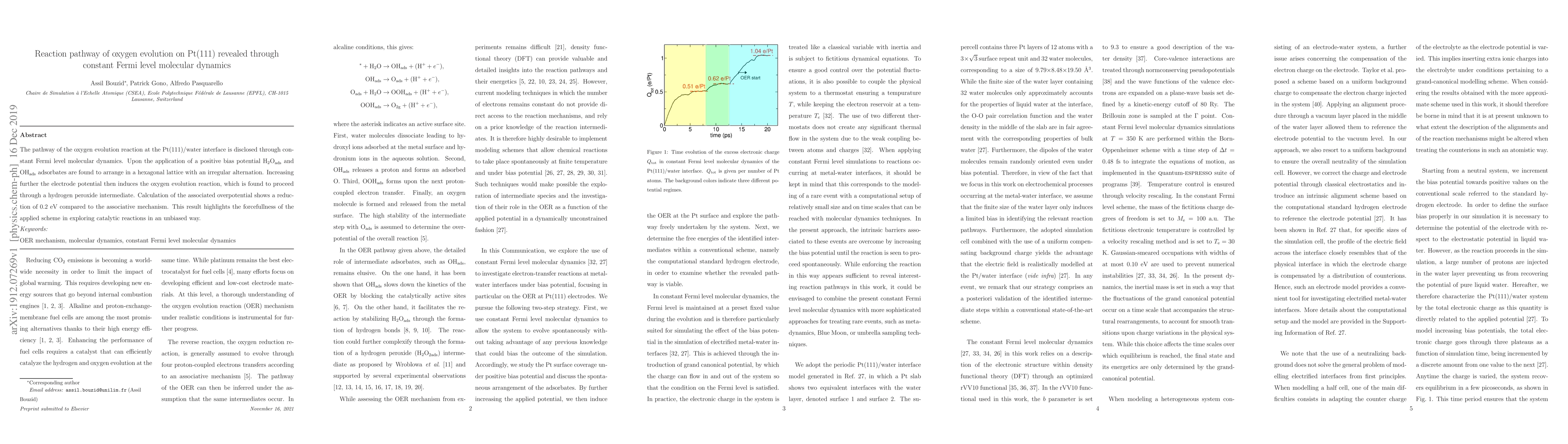 The pathway of the oxygen evolution reaction at the Pt(111)/water interface is disclosed through constant Fermi level molecular dynamics. Upon the application of a positive bias potential H 2 O ads and OH ads adsorbates are found to arrange in a hexagonal lattice with an irregular alternation. Increasing further the electrode potential then induces the oxygen evolution reaction, which is found to proceed through a hydrogen peroxide intermediate. Calculation of the associated overpotential shows a reduction of 0.2 eV compared to the associative mechanism. This result highlights the forcefullness of the applied scheme in exploring catalytic reactions in an unbiased way.