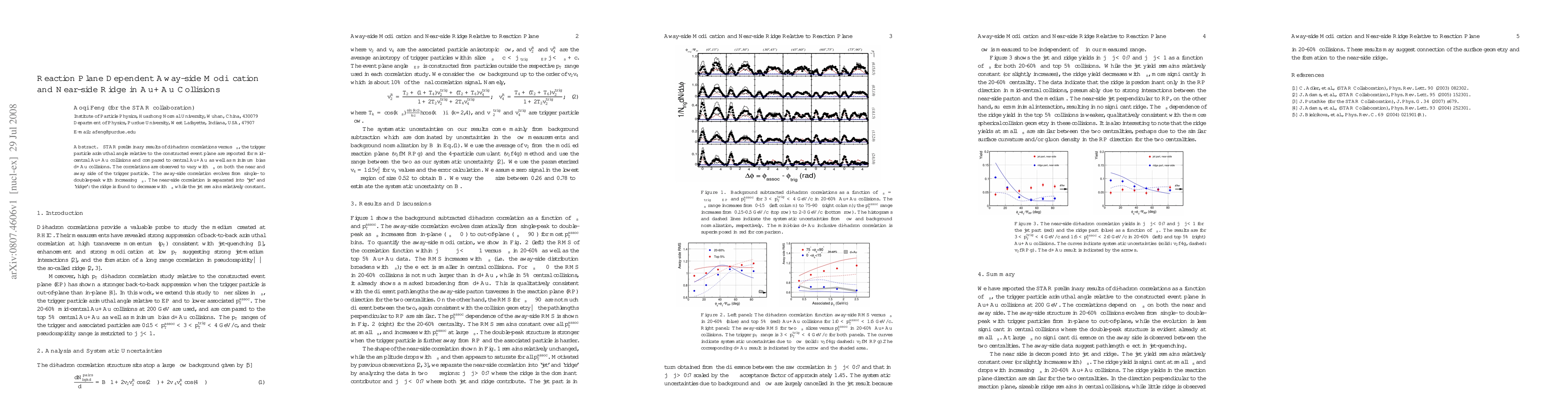 STAR preliminary results reveal di-hadron correlations in Au+Au collisions that vary with $\phi_{s}$, showing an away-side modification that transitions from single- to double-peaks. The near-side exhibits a ridge that diminishes with $\phi_{s}$, contrasting with a stable jet component.