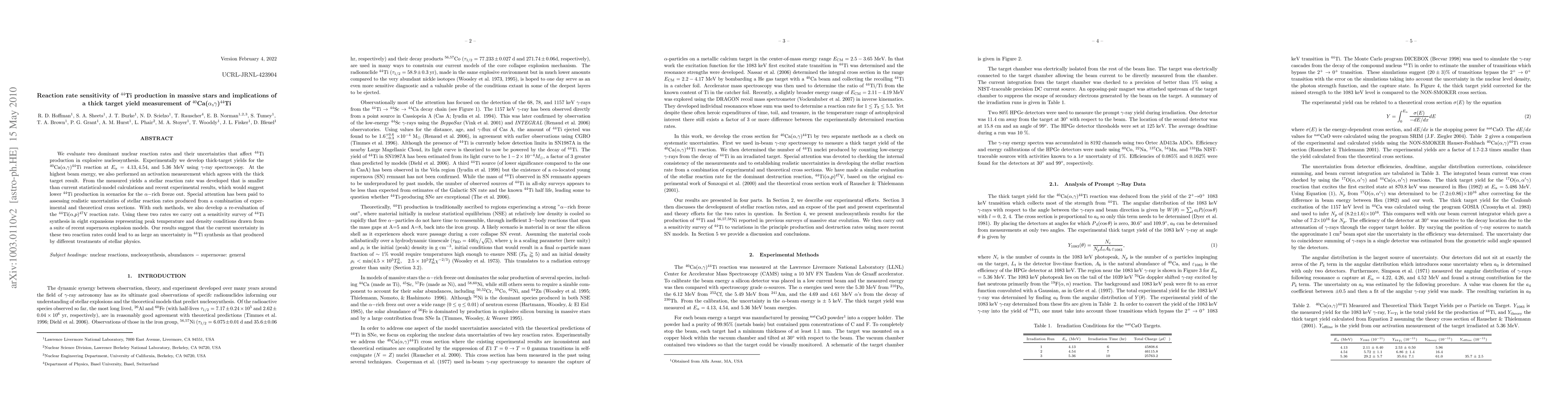 This paper evaluates the nuclear reaction rates affecting 44Ti production in massive stars, developing new thick-target yields for the 40Ca(alpha,gamma)44Ti reaction. The new reaction rate is found to be lower than previous models, suggesting reduced 44Ti production in alpha-rich freeze-out scenarios, and highlighting significant uncertainties in 44Ti synthesis due to these reaction rates.