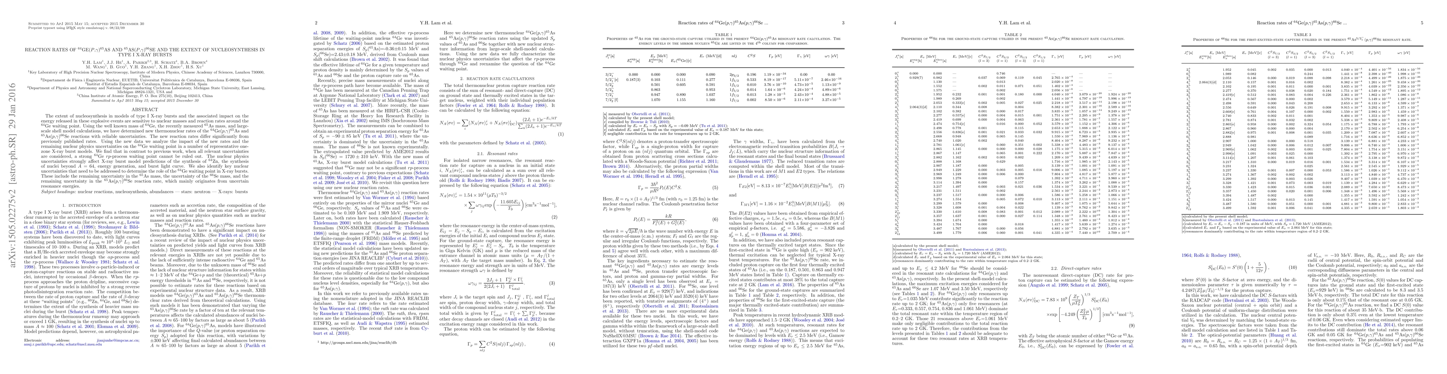 This paper determines new thermonuclear rates for the $^{64}$Ge($p$,$\gamma$)$^{65}$As and $^{65}$As($p$,$\gamma$)$^{66}$Se reactions, finding significant differences from previous rates. It analyzes the impact of these new rates on nucleosynthesis and energy release in type I X-ray bursts, revealing that uncertainties in nuclear physics still allow for a strong $^{64}$Ge $rp$-process waiting point.